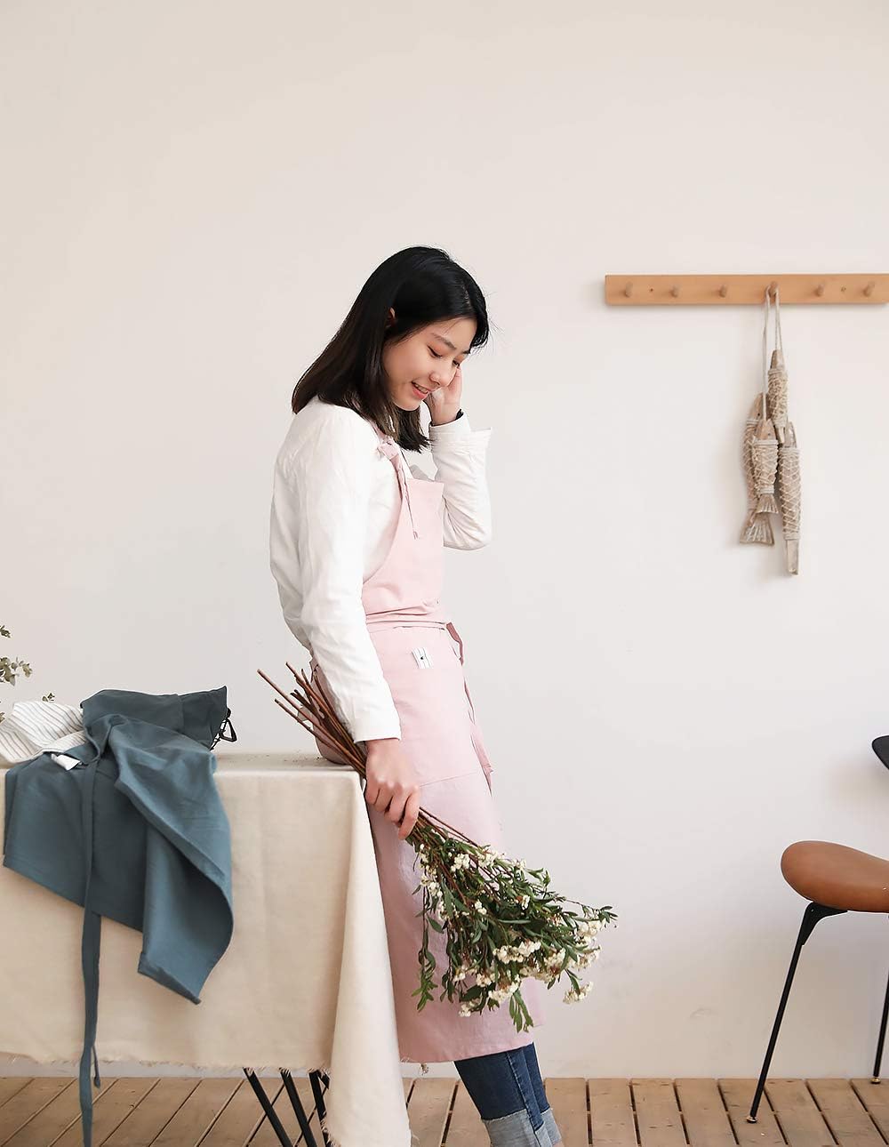 Adjustable Japan Nordic Style Soft Cotton Linen Apron with Four Pockets A Towel