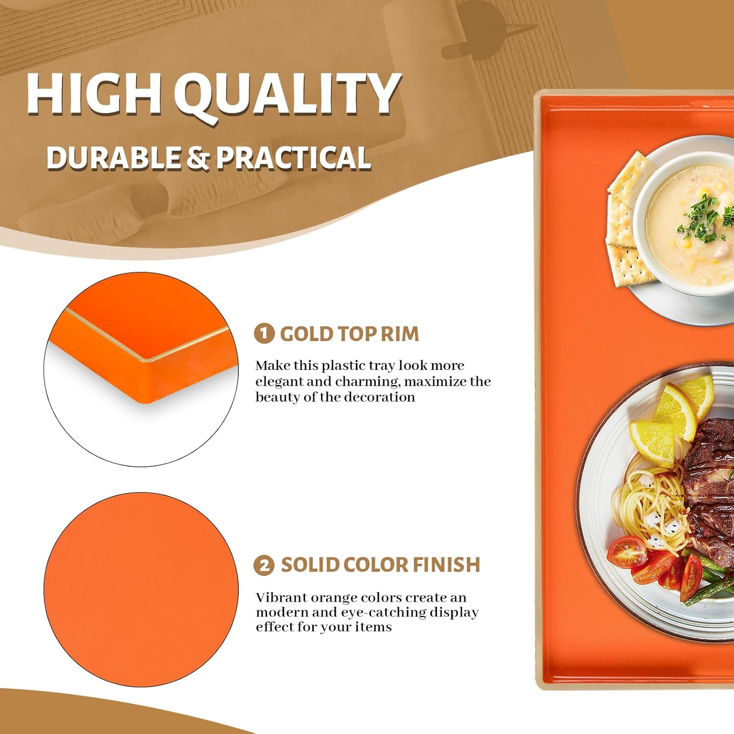- TRAY DECOR: Orange tray is often used to present food and drinks in an appealing and organized manner. Rectangle tray can enhance the visual appeal of the items being served, making them more enticing to guests or customers. Also place it on your bathroom vanity as an exquisite showcase for perfumes, jewelry, or bath accessories.