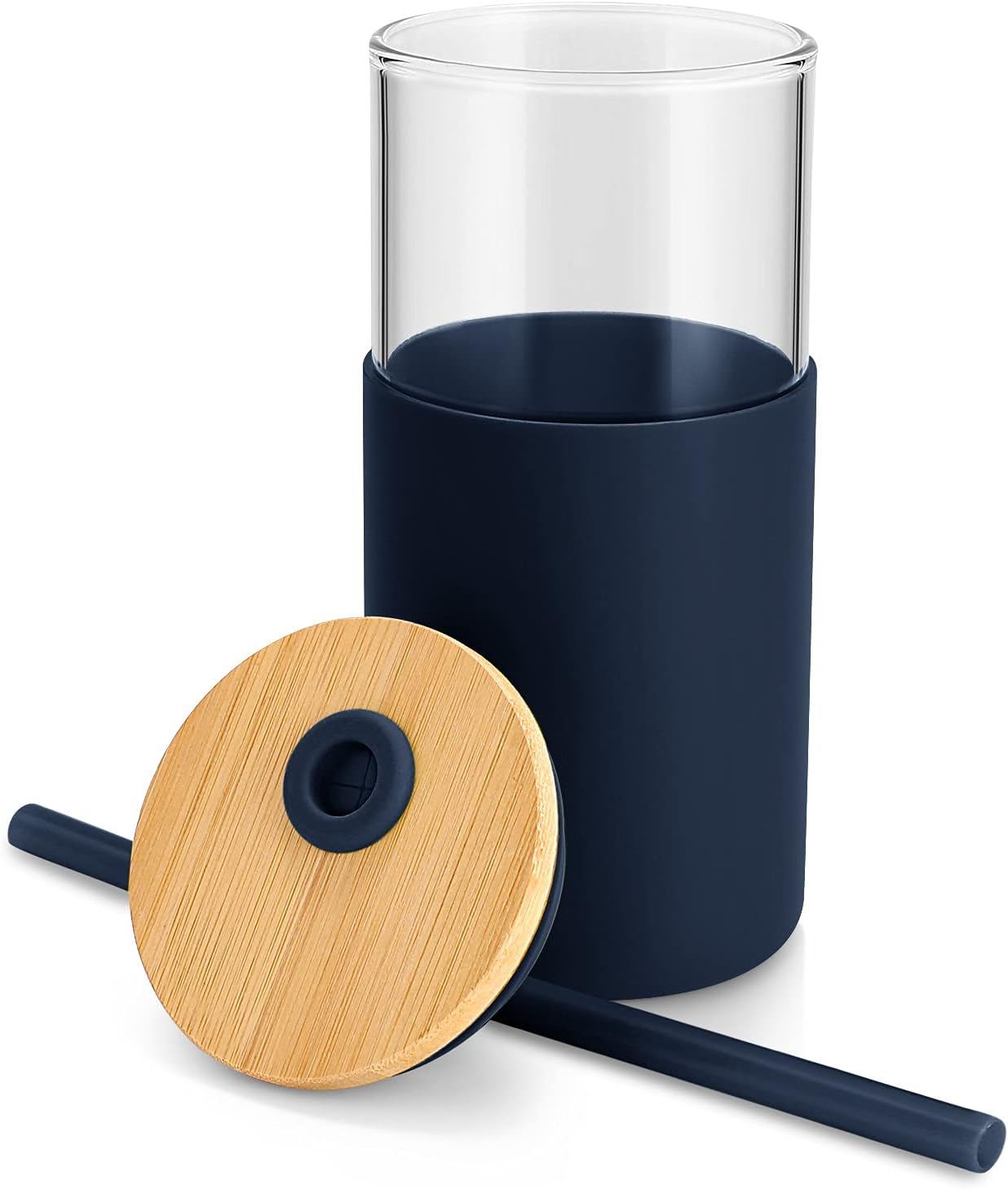 Tronco 16 oz Glass Tumbler with Straw and Bamboo Lid, Iced Coffee Cup Reusable, Smoothie Cups, Tumbler with Silicone Protective Sleeve - BPA Free