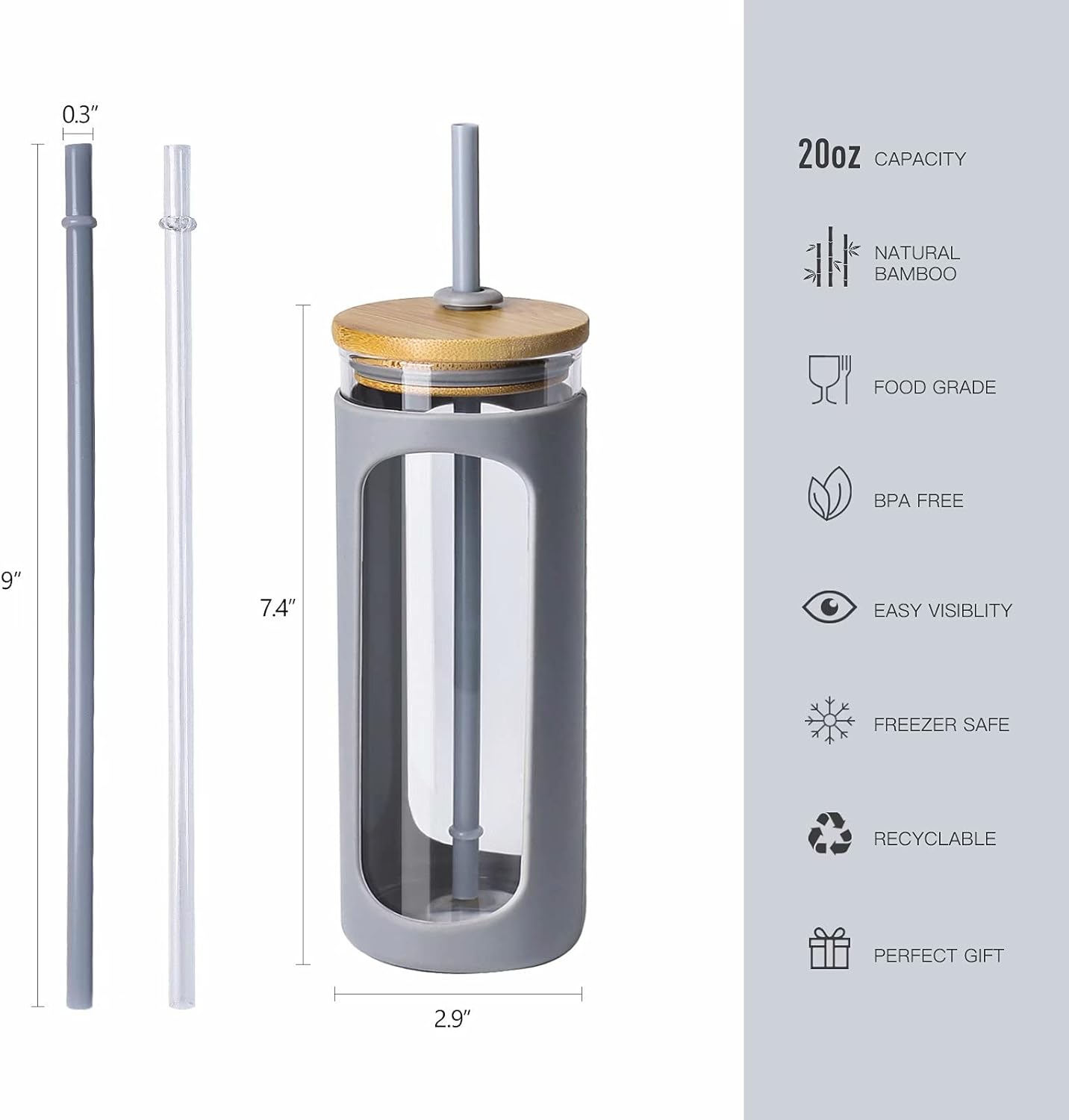 Kodrine 20oz Glass Water Tumbler with Straw and Lid, Bamboo Lids Water Bottle, Iced Coffee Cup Reusable, Wide Mouth Smoothie Cups with Protective Silicone Sleeve BPA FREE-Grey