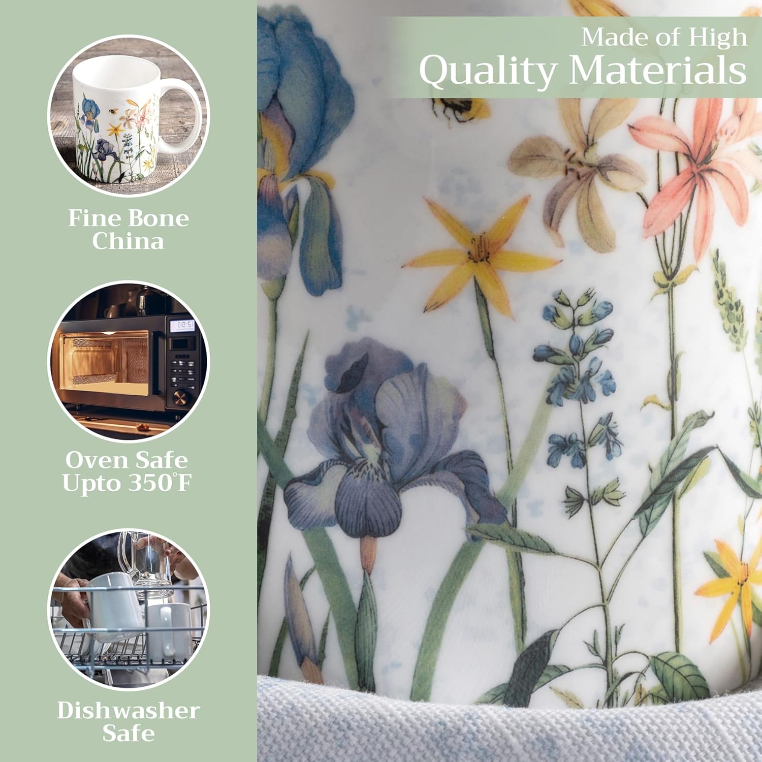 - Easy Care & Maintenance: Microwave, dishwasher, and oven safe up to 350°F. These bone china mugs are built for convenience and durability, making cleanup and reheating simple without compromising on quality