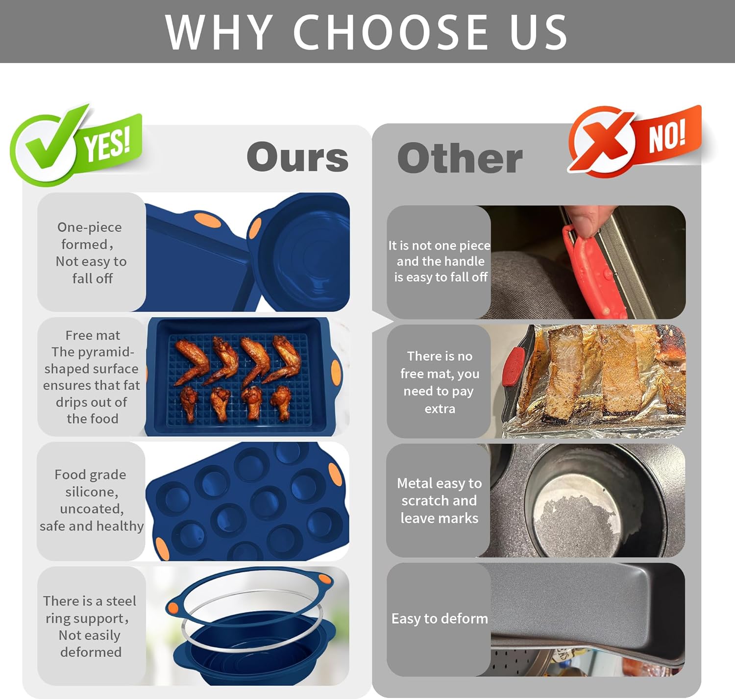 To encounter 8 in 1 Silicone Baking Set - 6 Cake Molds - 2 Silicone Baking Mat, Nonstick Cookie Sheet, Cake Muffin Bread Pan with Grips and Metal Reinforced Frame More Strength, Navy Blue