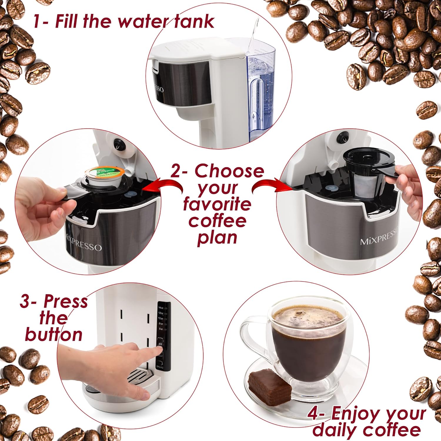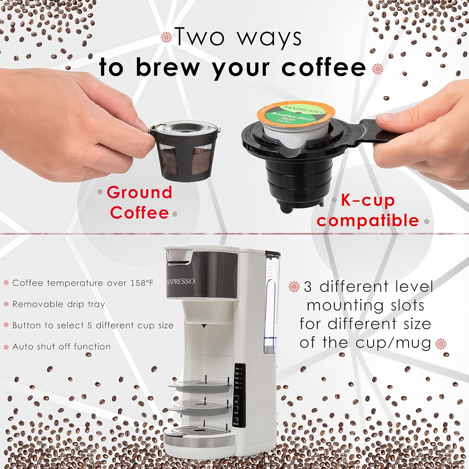 Mixpresso White Single Serve Coffee Brewer K-Cup Pods Compatible & Ground, 30 oz Compact Coffee Maker Single Serve With 5 Brew Sizes Up To 14 Oz, Fits Travel Mug, Adjustable Drip Tray
