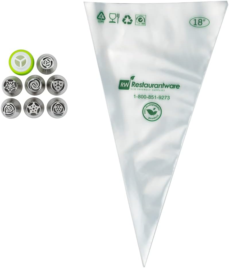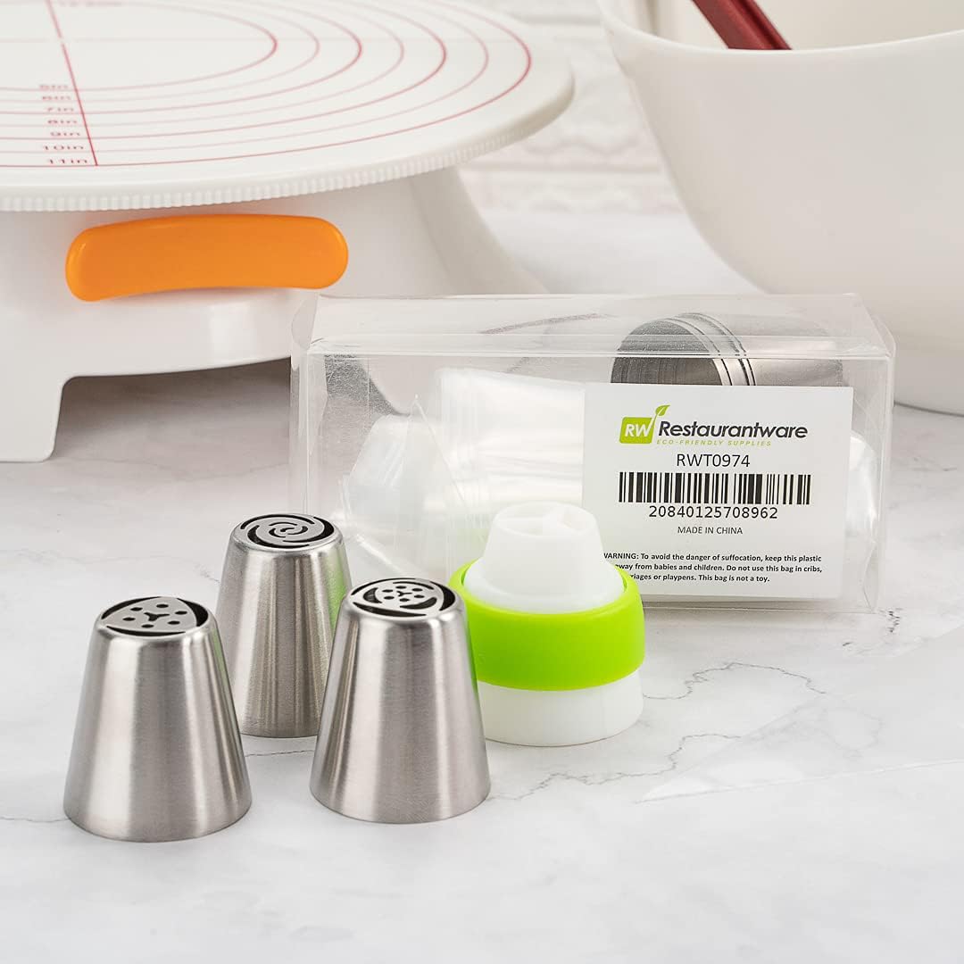 Restaurantware Pastry Tek Russian Piping Tips Set 18 Piece Durable Cake Decorating Kit - 7 Piping Tips 10 Piping Bags Stainless Steel Piping Bags And Tips Set 1 Tri-Color Coupler