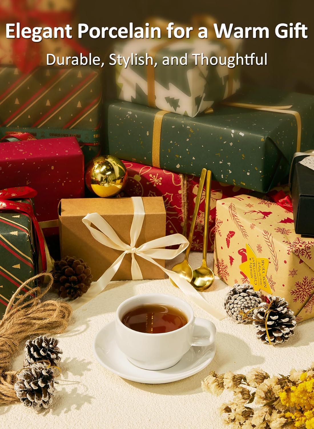 Yedio Porcelain 4 oz Espresso Coffee Cups with Saucers and Metal Stand, Porcelain White Stackable Cappuccino Cups Set of 4