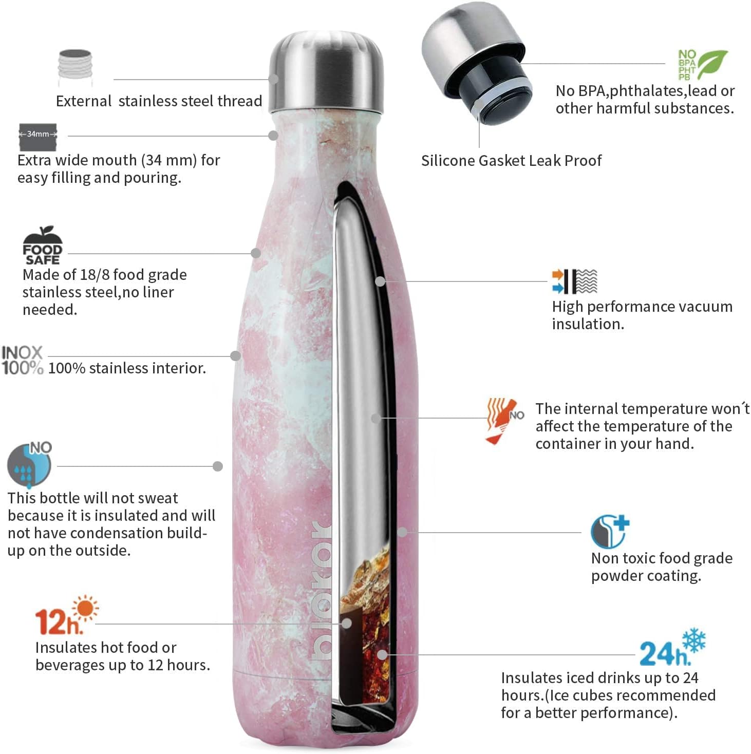 - Keep Drinks Cold & Hot: Adopt double wall vacuum insulation design, keep your drinks ice cold for 24 hours and hot for 12 hours within our highly performed insulated water bottle