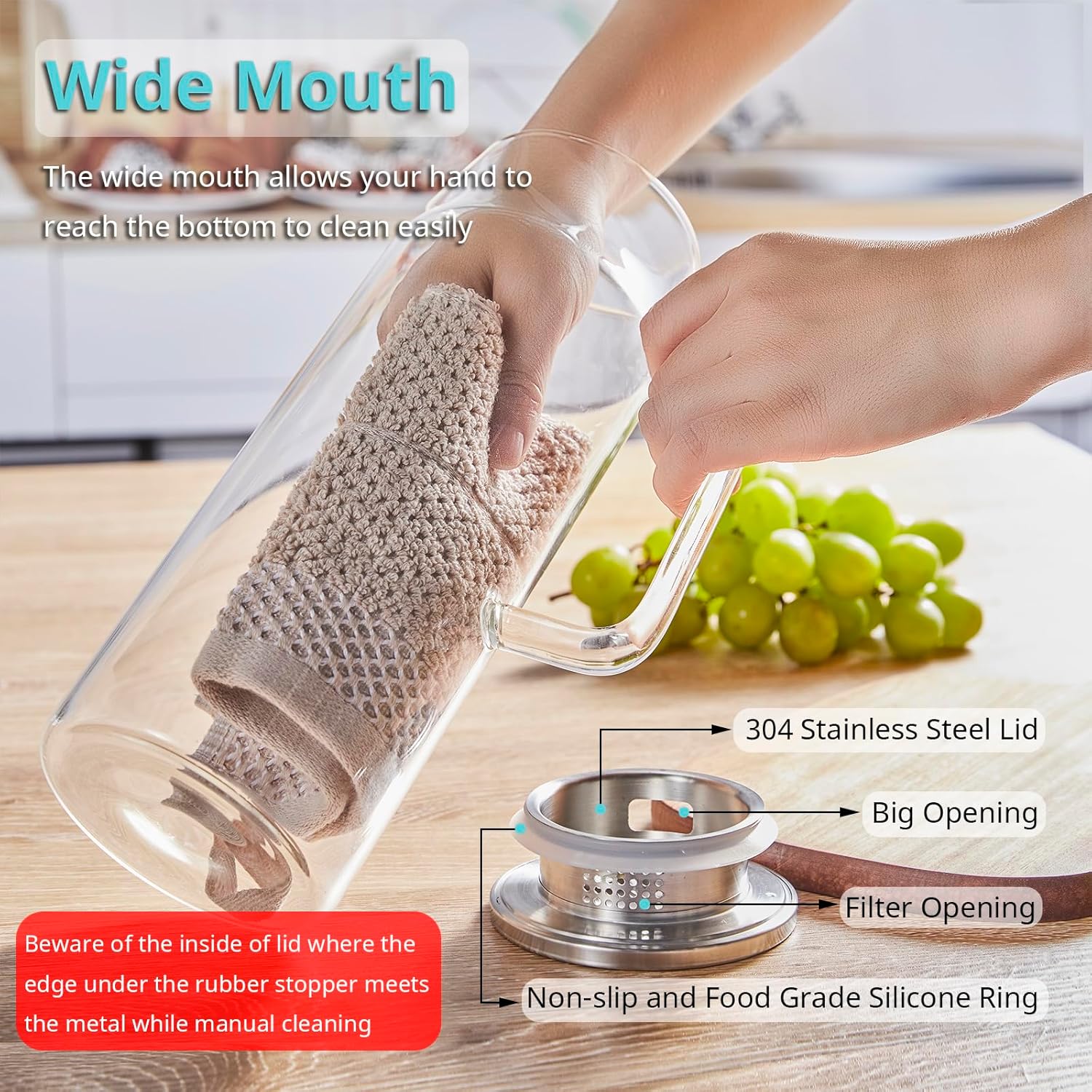 - Wide Mouth Opening for Easily Clean: Both the lid and the pitcher itself are extremely easy to clean, you can even clean it in the dishwasher. The wide mouth will allow your hand to reach in and clean down to the bottom. TIPS: THE METAL EDGES BENEATH THE RUBBER SEAL CAN BE VERY SHARP. WHEN YOU REMOVE THE SILICONE RING TO CLEAN LID, PLEASE BE EXTREMELY CAREFUL.