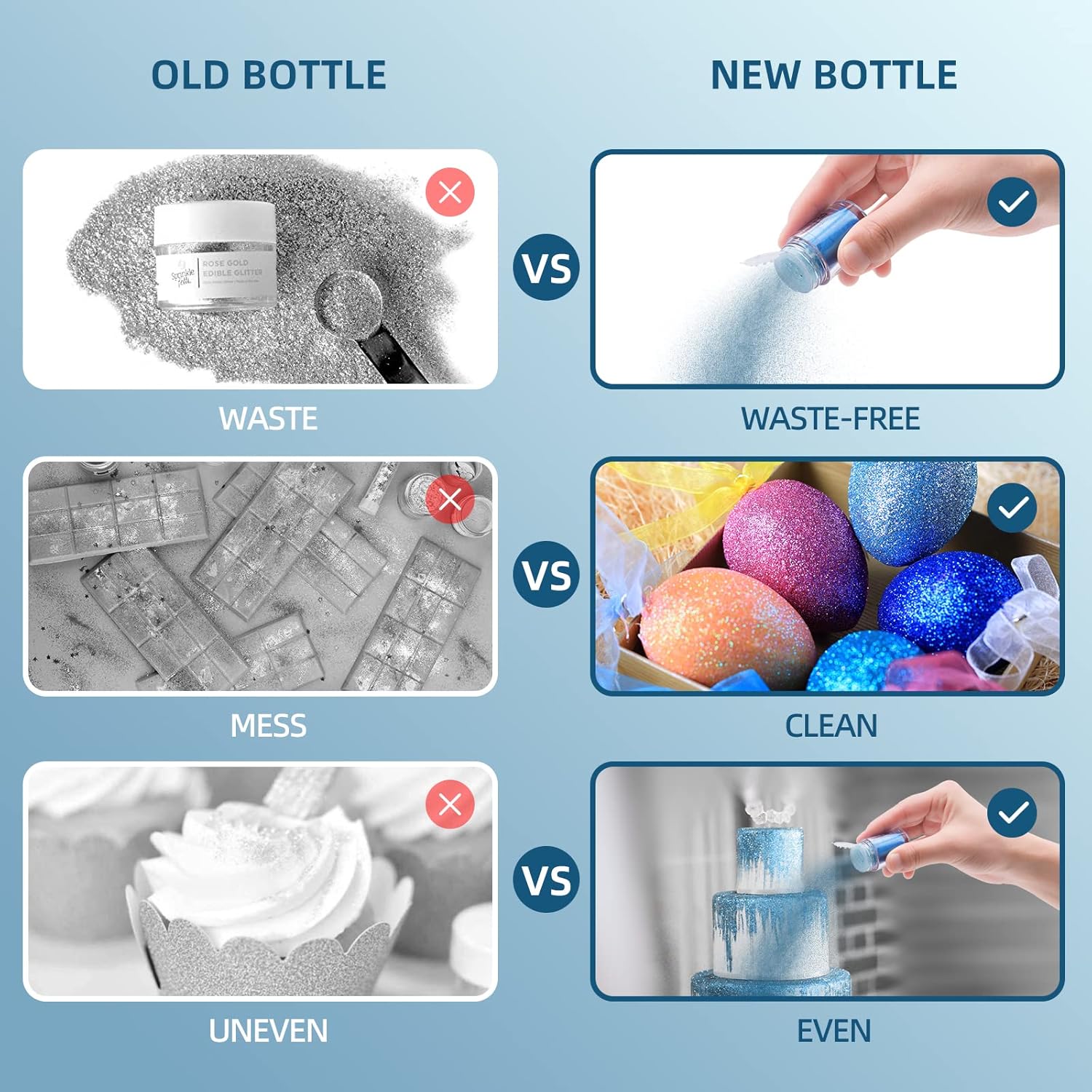 - EASY TO USE - Edible glitter powder is pack in the easy-pour jar, you could easily and precisely apply the luster powder to your projects. Brush dry onto your projects directly, or dilute it with vodka or oil-based flavorings to apply on food with a brush. Please do not mix it with water or it will be clumpy.