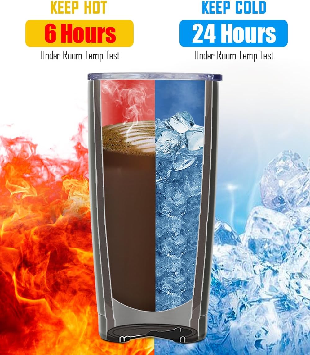 - Insulated 20 oz Coffee tumbler: Double-wall vacuum insulation technology, keep drinks hot for over 6 hours and cold for around 24 hours, sweat proof, no condensation