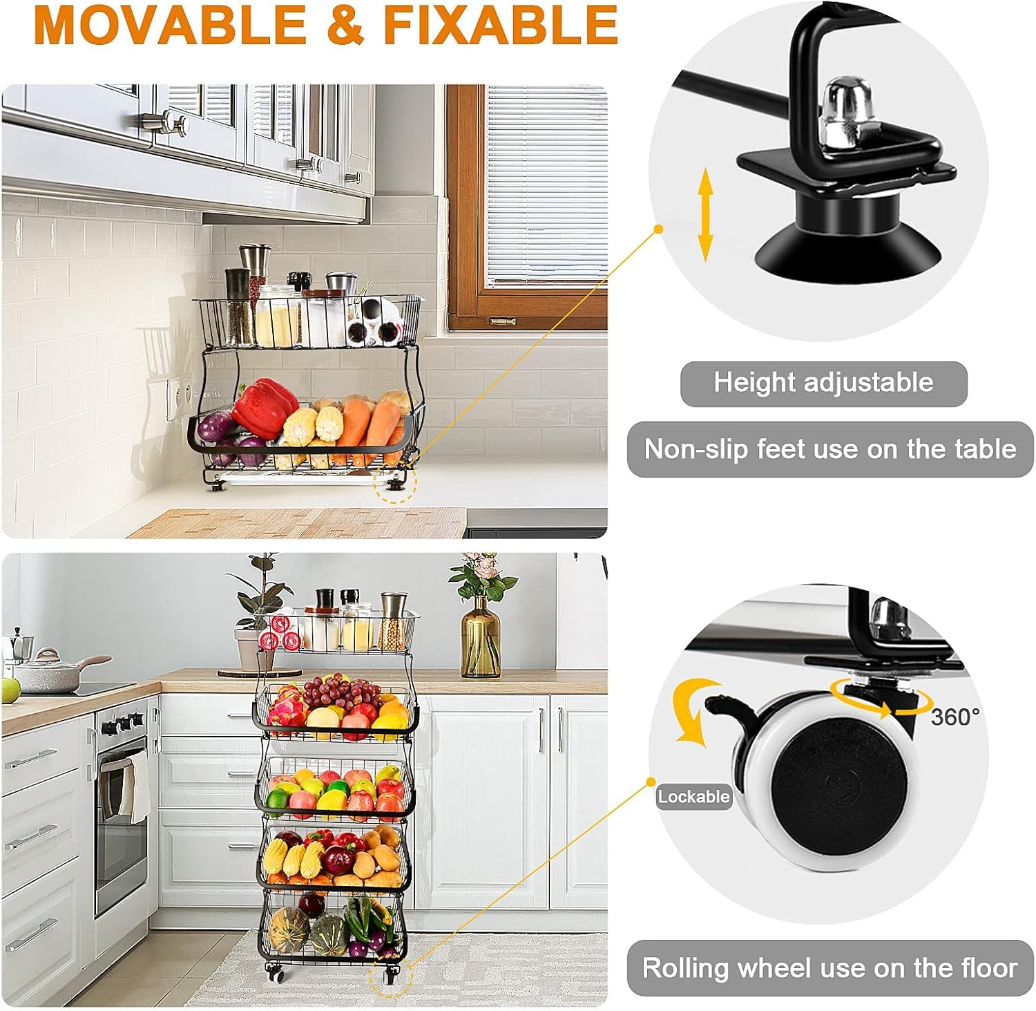 - Movable or Fixable: The kitchen storage fruit basket has 4 quality wheels(2 lockable) and 4 non-slip foot mats. 360 degree rotatable wheels help you move this rolling storage basket to wherever you want
