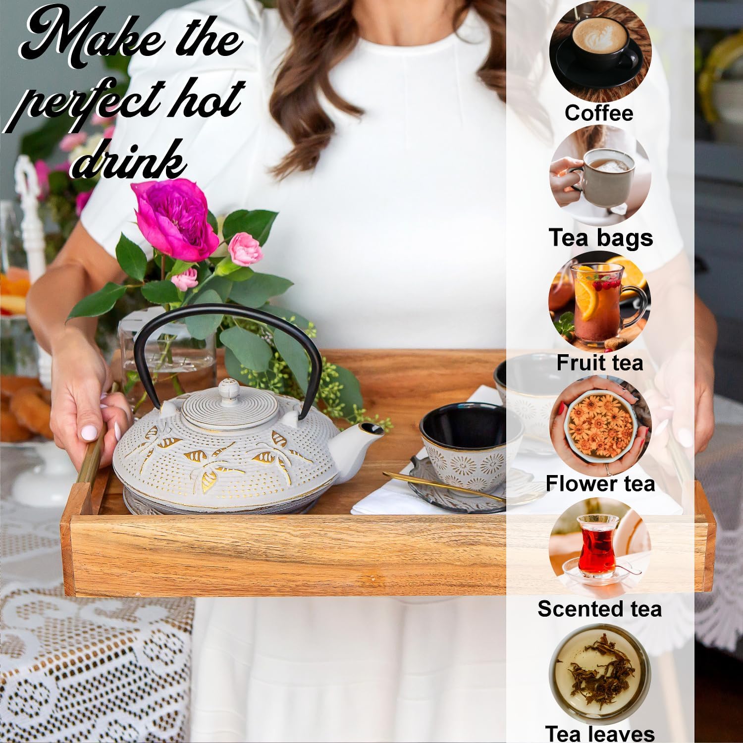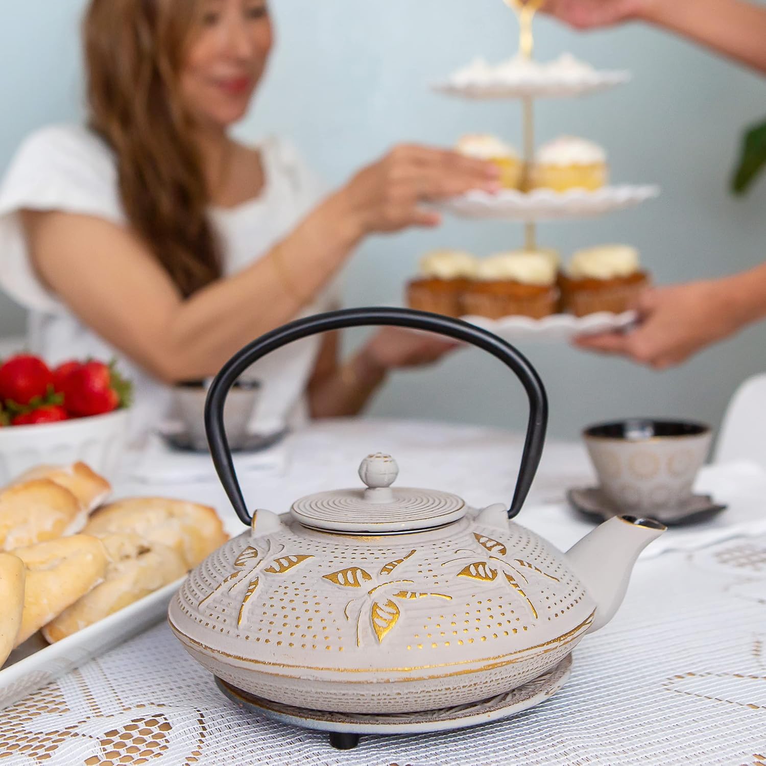 - WHAT'S IN THE SET? Contains one solid cast iron teapot weighing 3.2lbs and holds 25.36oz of your best quality Japanese Green Tea or brew of choice. 2 teacups with printed flower design and matching trivet, shaped saucers and stainless steel tea infuser. Rust-Proof enamel inside, with a hand painted and glazed exterior, which makes this “tetsubin”, a tetsu kyusu! Made for brewing tea but not for boiling.