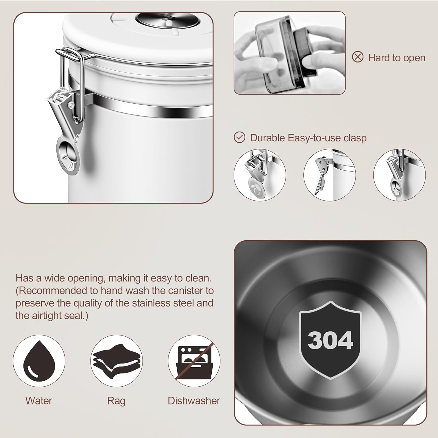 - 【STAINLESS STEEL COFFEE CONTAINER】Made from high-quality 304 stainless steel, the opaque body creates an ideal environment for storing coffee beans. The canister blocks out light and moisture to protect your ingredients—whether they’re coffee beans, dried nuts, or other pantry staples.Its robust construction offers long-lasting durability.