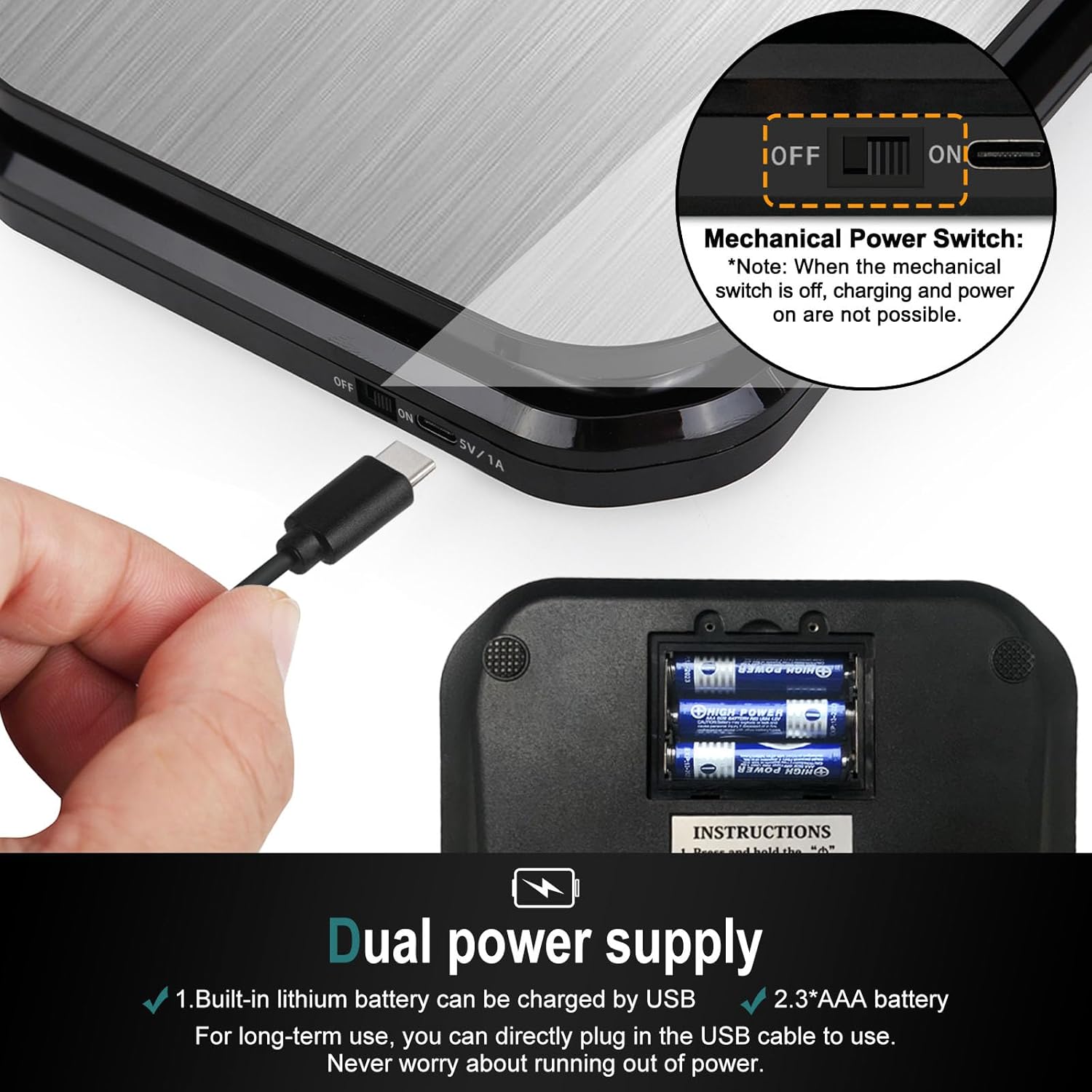 - [ Dual power supply, USB Rechargeable ] With built-in lithium battery can be charged by USB cable. Can also be powered by 3 AAA batteries. (Accessories do not include AAA batteries)※Make sure to take out the AAA battery when washing