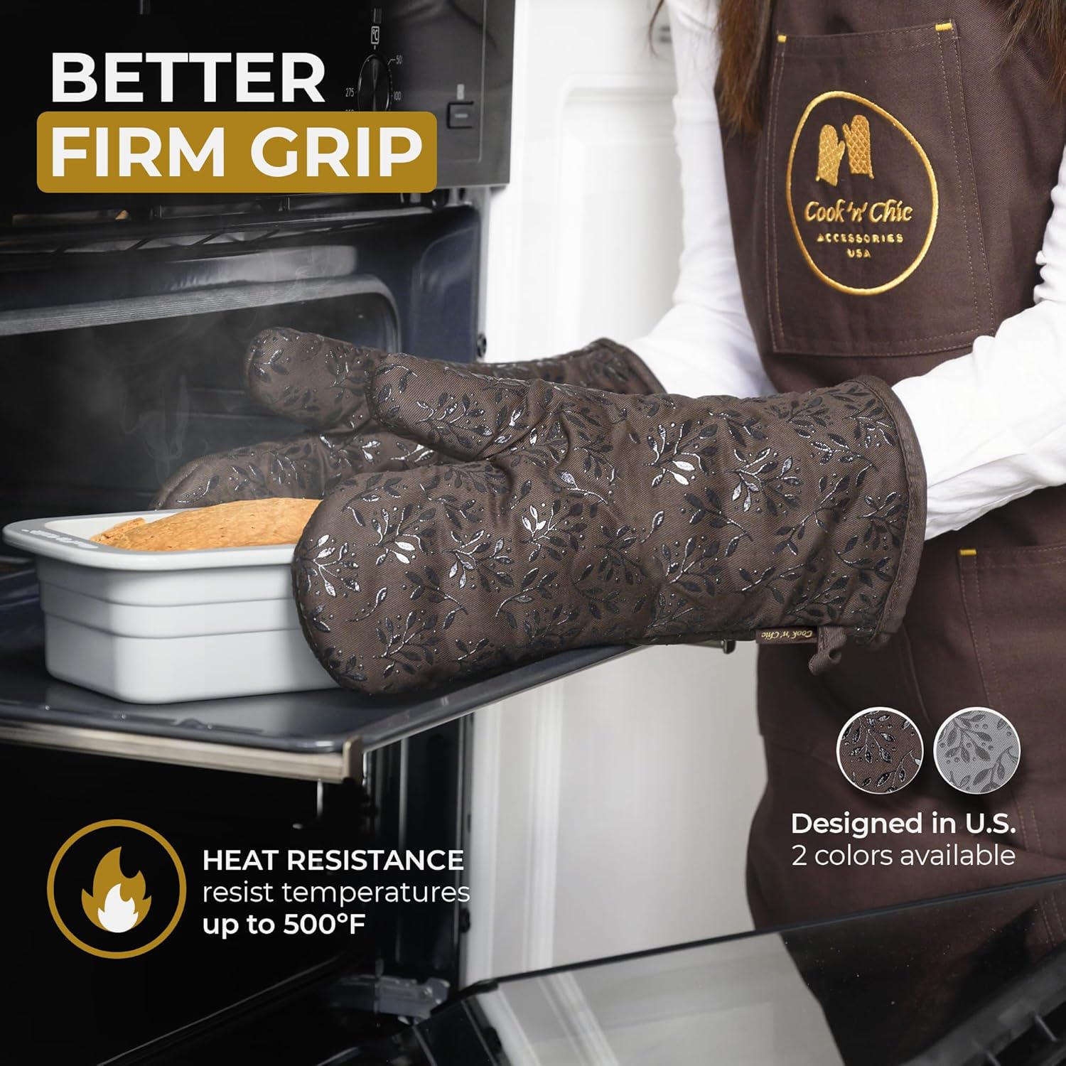 Premium Heat-Resistant Oven Mitts - Stylish and Beautiful - Non-Slip Platinum Silicone Grip - Long and Thick - 100% Natural Cotton Exterior and Soft Terry Cloth Lining - Set of 2 by Cook'n'Chic