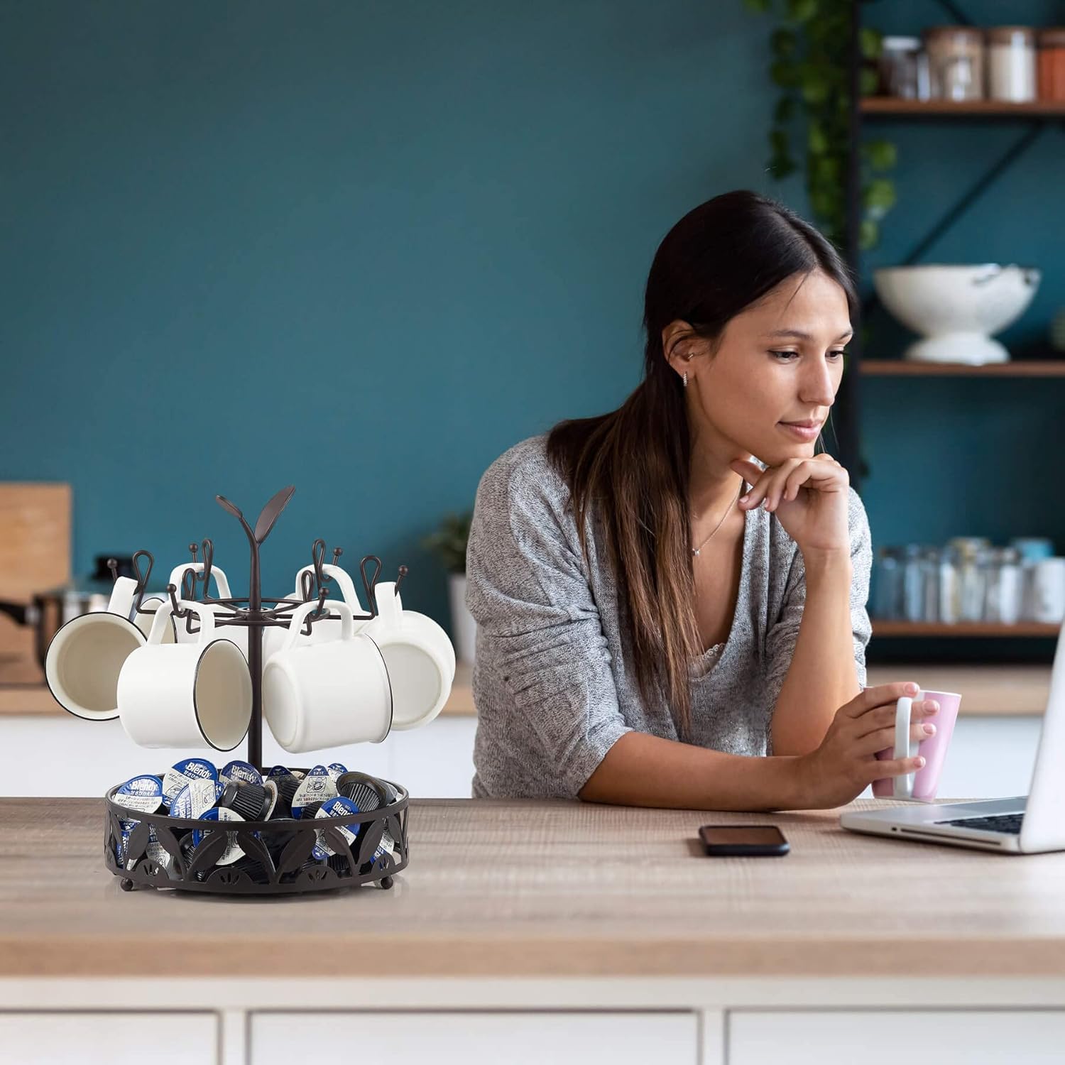 - Rotatable Display - This coffee pods holder and cup rack is designed to hold up to 6 mugs and cups and a large amount of coffee pods. When it is placed in the corner, you just need to toggle the top peg to get the innermost mug without moving the whole coffee cup holder, and it is also a great way to display your collection of mugs.