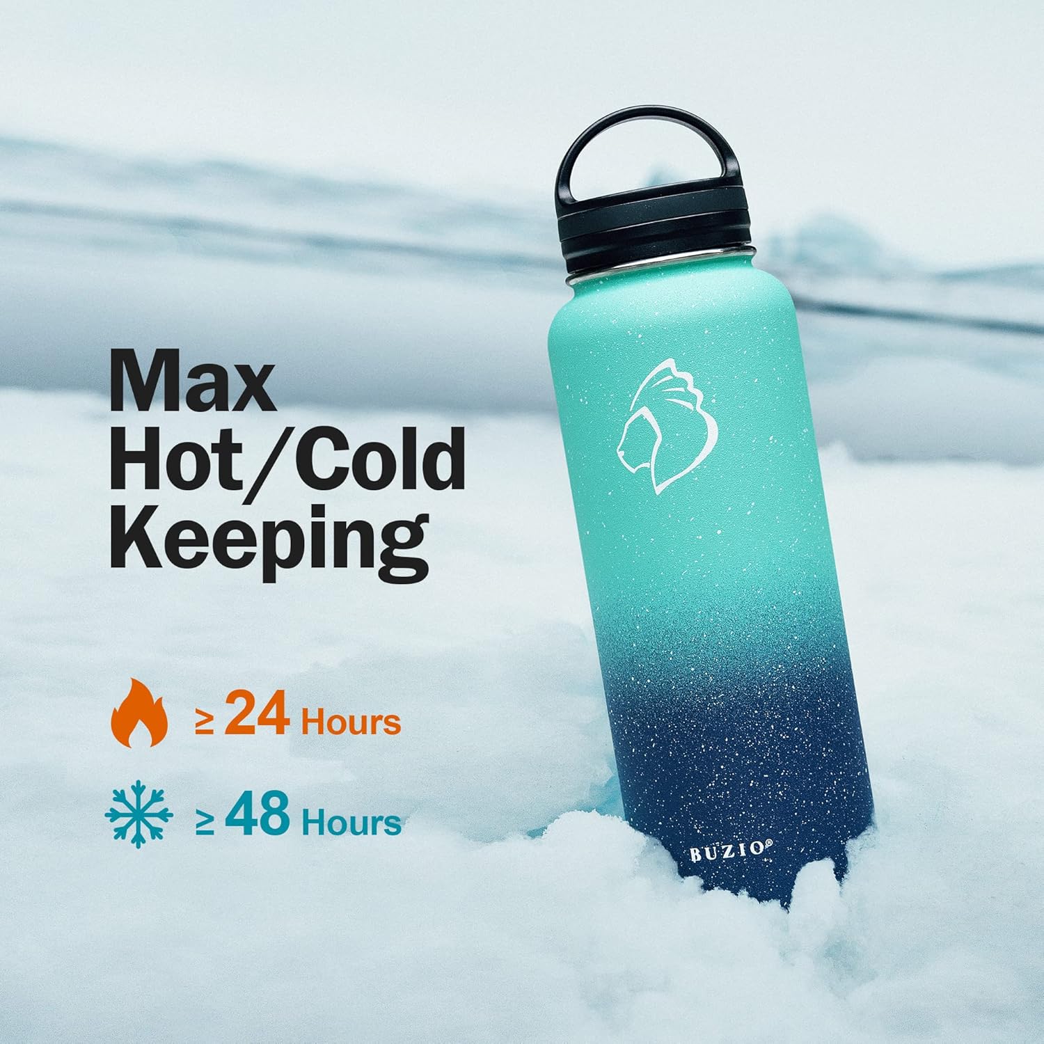 - Vacuum Insulated Water Bottle: Made of double wall 18/8 food-grade stainless steel, BUZIO ThermoArmour water bottle keeps liquids icy for up to 48 hours or hot for up to 24 hours.