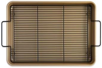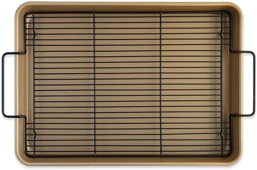 - A high-sided nonstick half sheet, for pot-luck sized portions of cakes, lasagna or bars, with a black non-stick rack insert for making jerky, dried fruits, crisp fries, roasts, perfect oven-baked bacon and more