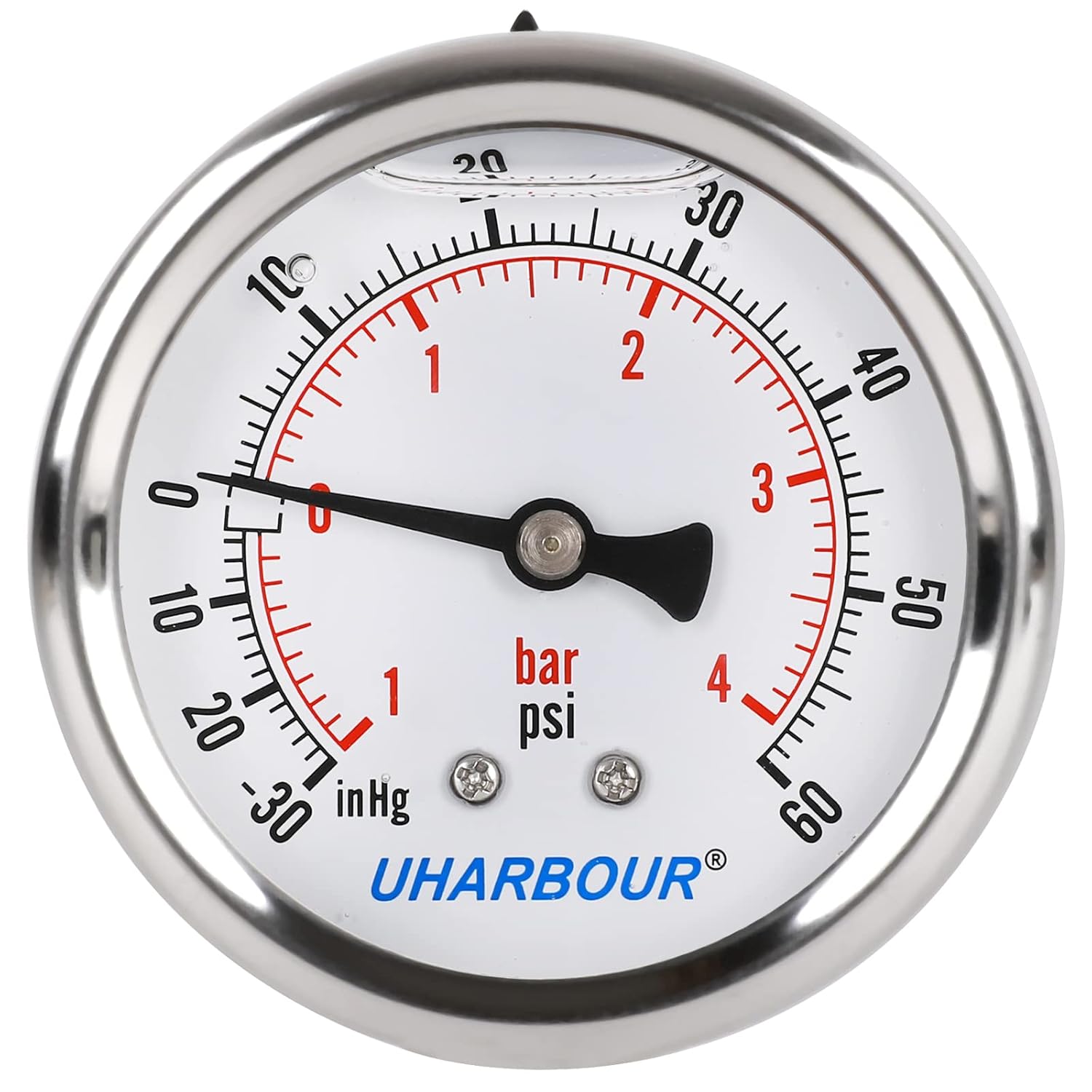 Glycerin Filled Vacuum Pressure Gauge, 2-1/2" Clear dial,1/4" NPT Back Connection, Stainless Steel Case, Brass Movement, Dual Scales -30HG/60PSI……