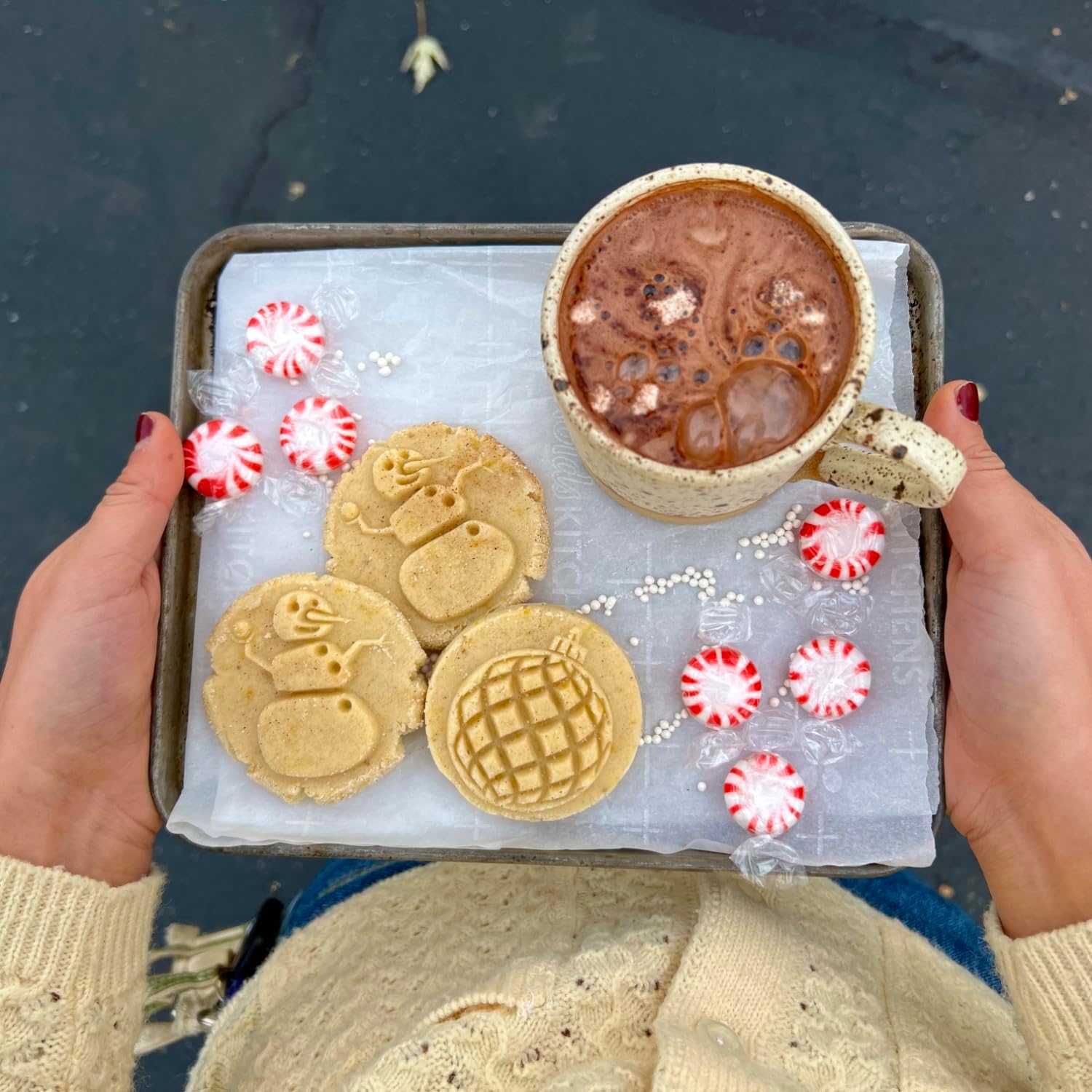 - The cookie stamp is easy to use. Roll out your dough to your preferred thickness and lightly dust your dough and stamp with flour. Press firmly around the stamp to get a deep impression.