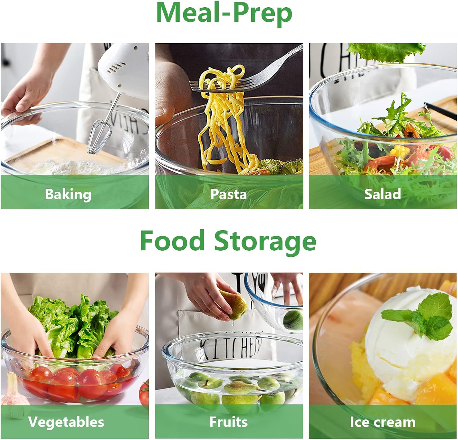 - Practical & Functional Bowls: You can use 1QT Small Glass Bowl as a prep bowl. 1.5QT Medium Glass Bowl as a salad bowl, 2.5QT Large Glass Bowl for for mixing fruits or vegetables, 3.7QT Extra Large Glass Bowl for mixing dough, beating eggs and storing overnight oats. Perfect kitchen helpers! Would make a nice housewarming gift.
