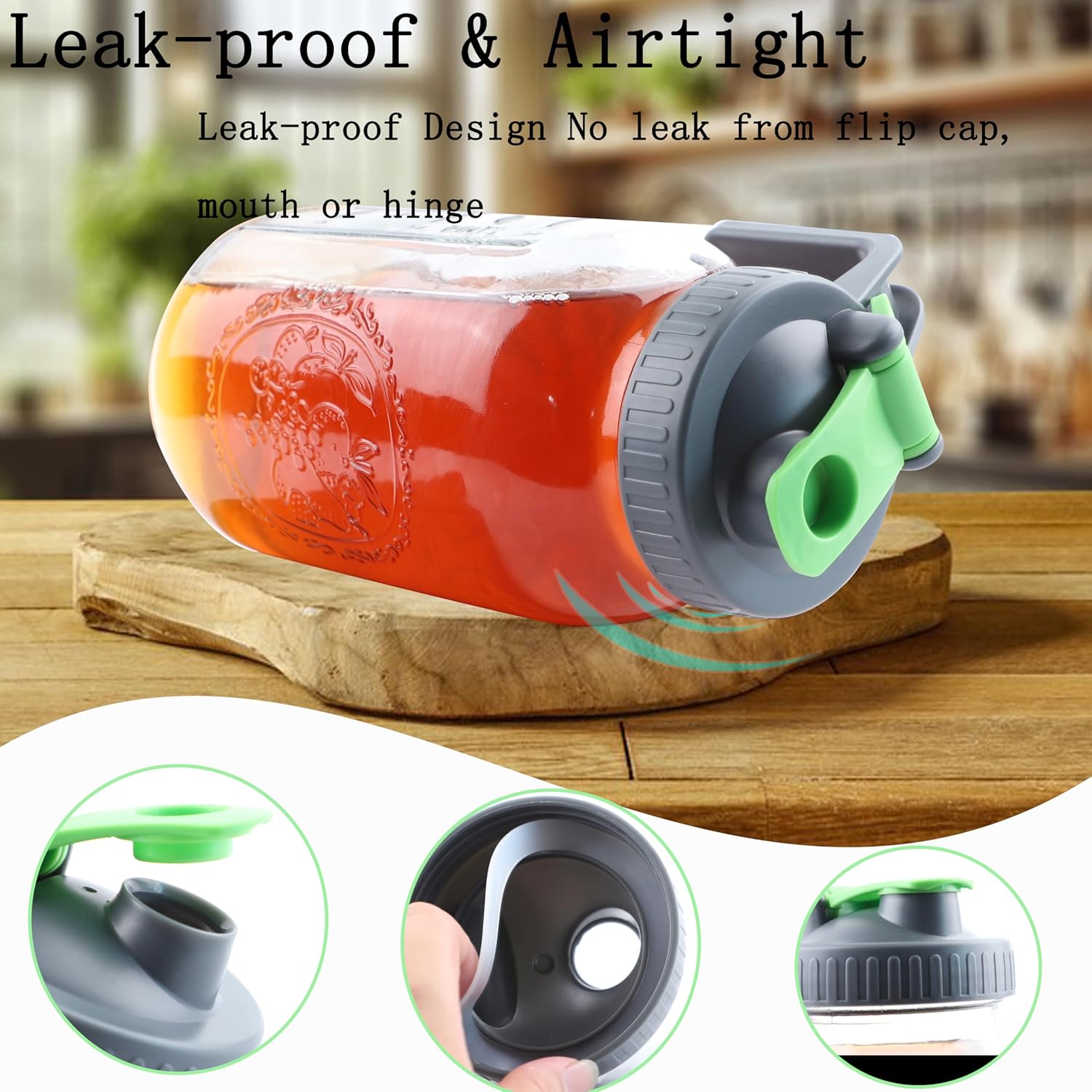 - LEAK PROOF & AIRTIGHT STORAGE - Mason Jar coffee Pitcher with silicone seal that will ensure not leak what so ever (even while shaking it upside-down🙃). The top flip cap has a secure snap fit closure that will not leak neither. Airtight container to keep your drinks fresh!