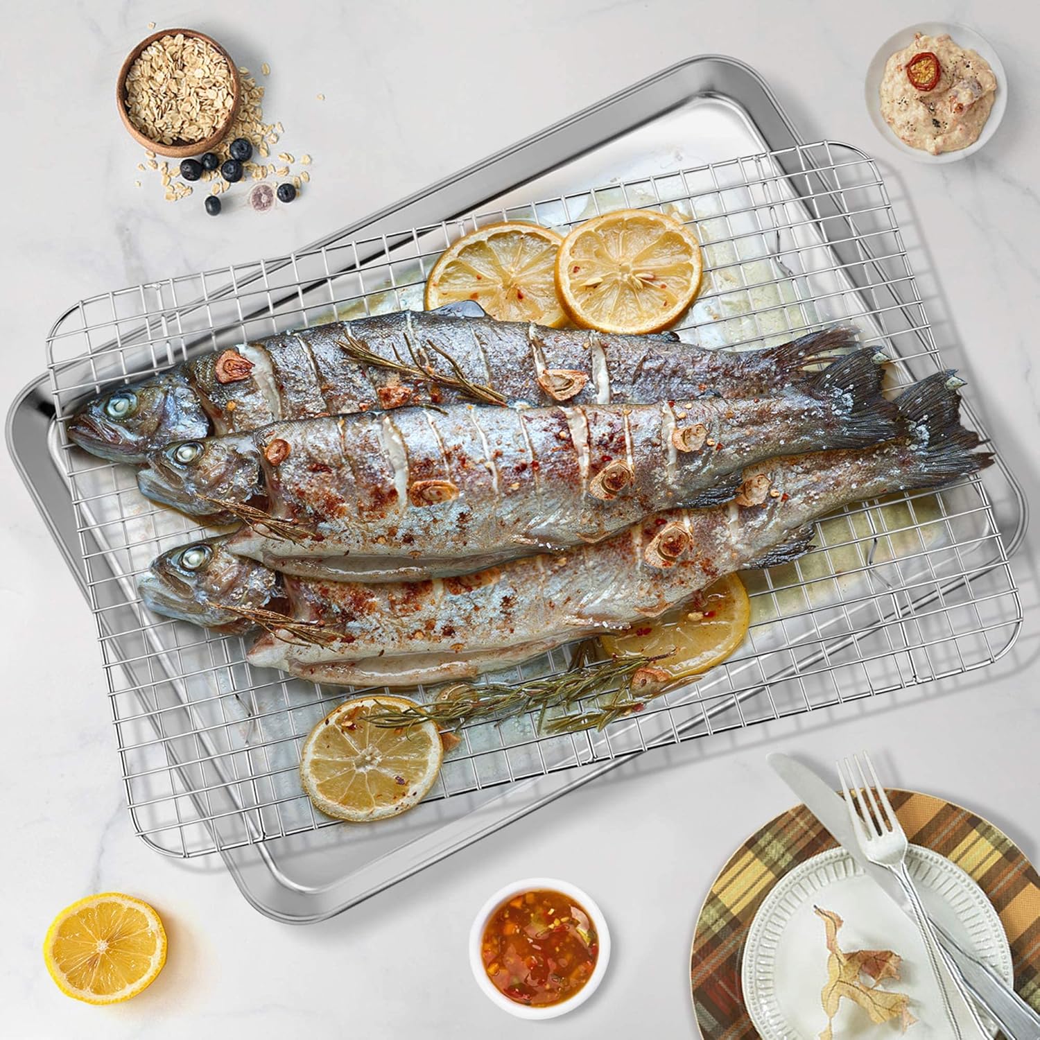 - 【MULTIFUNCTIONAL USE】Baking tray with baking rack are ideal for cooking, roasting or cooling, Using separately or together is on your choice to create endless possibilities of baking, Using together can keep grease on the pan and get crispy food on the rack, To be a perfect bakeware set of home or restaurant, A thoughtful present for family or friends on anniversary, birthday, wedding, or house-warming