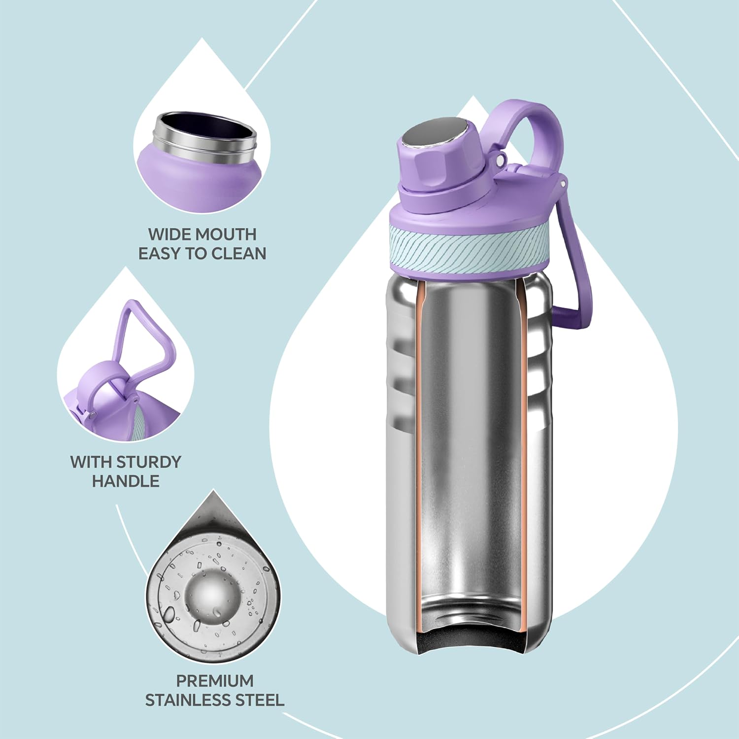 IDEUS Insulated Stainless Steel Water Bottle with 2 Leak-Proof Lids, Thermal Water Flask for Hiking Biking, 18oz, Violet