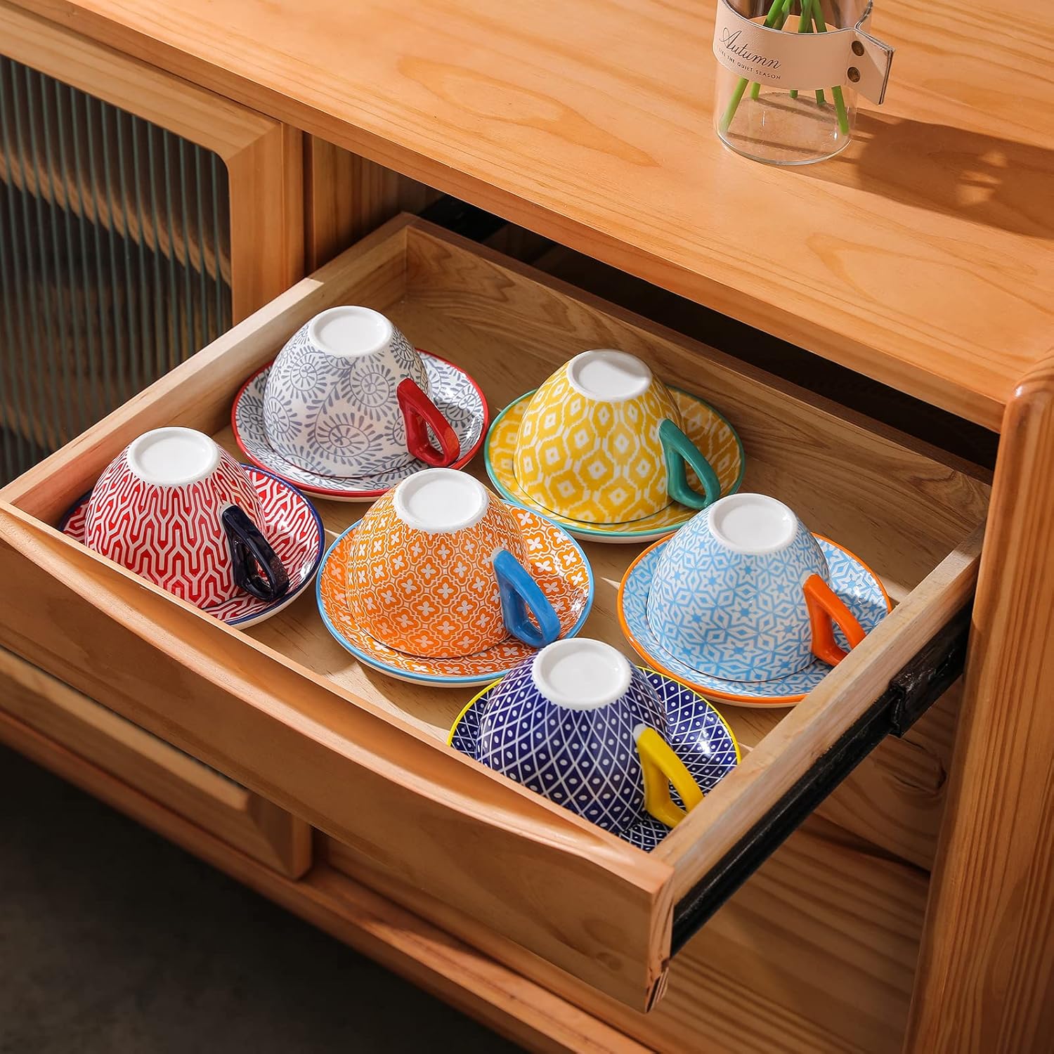 - DECORATIVE DESIGN - Each cappuccino cup with a matching saucer has unique patterns with bright colors, which light up your table and make a great addition to any party or your cabinet, and is perfect for all occasions.