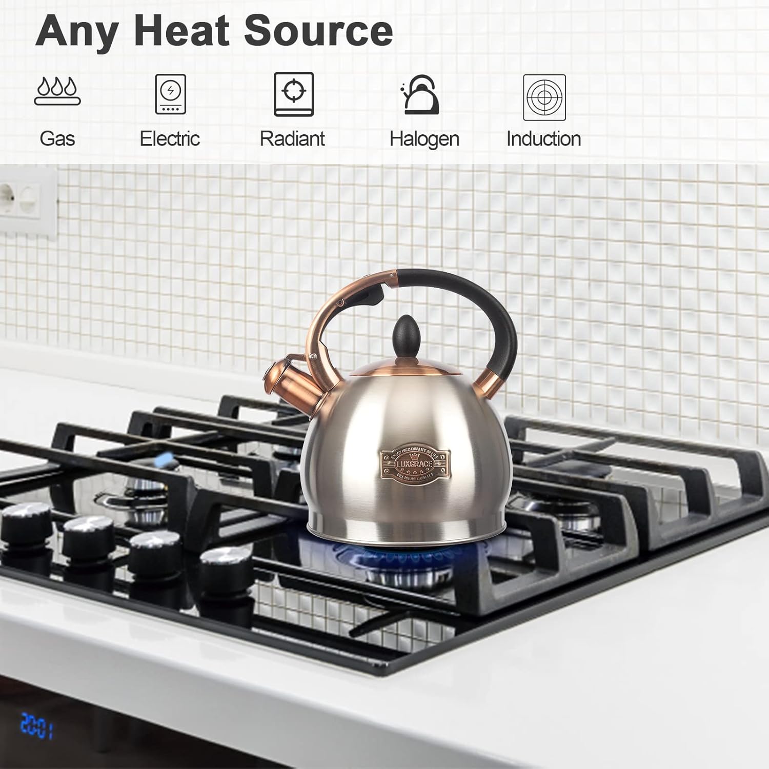 - Perfect Whistling Sound of Teakettle: This tea kettle for stovetop has a tight-fitting lid keeps steam in the hot tea kettle for rapid heating, and realse pleasant whistles sound when water reaches a boil, Loud enough to alarm you when you busy in the next room.