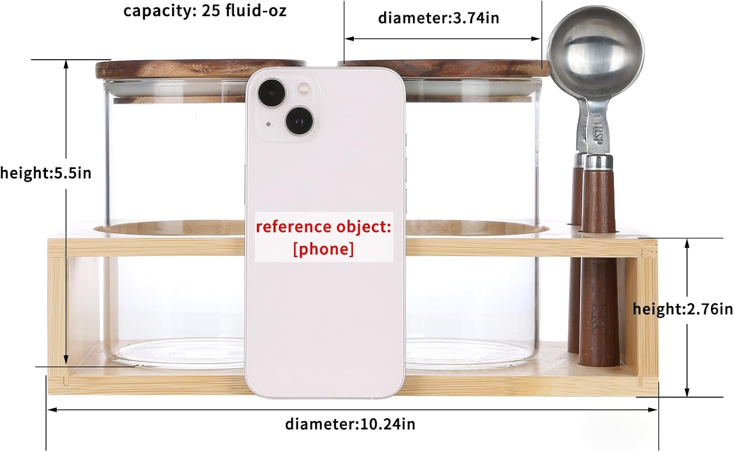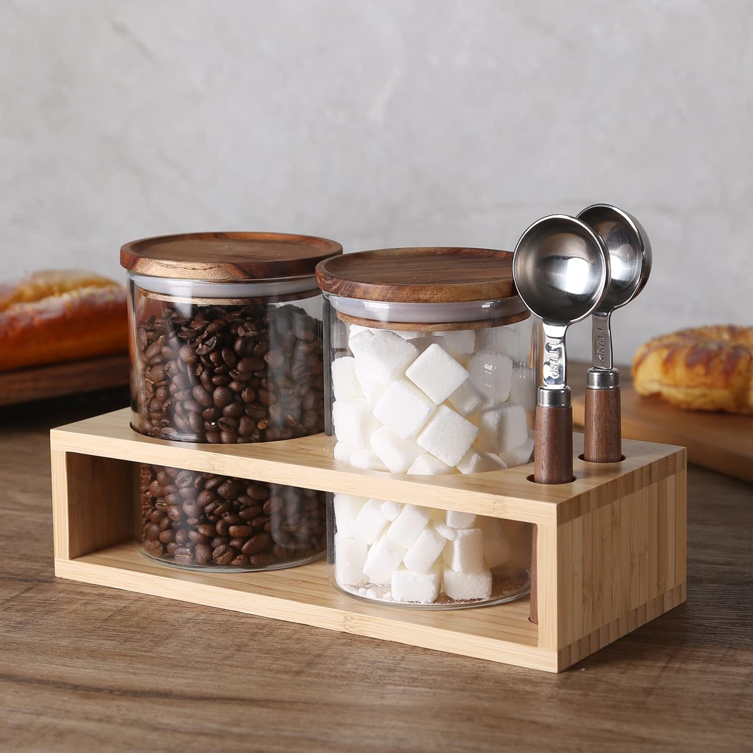 - Complete Set Includes:2 glass sealed jars (Height 5.5'' x Diameter 3.74'',Capacity:25fl oz/750ml),2 wooden handle scoops(1 TBSP) and 1 bamboo rack(10.24'' x 4.5'' x 2.76'' ,L x W x H),Label Stickers.