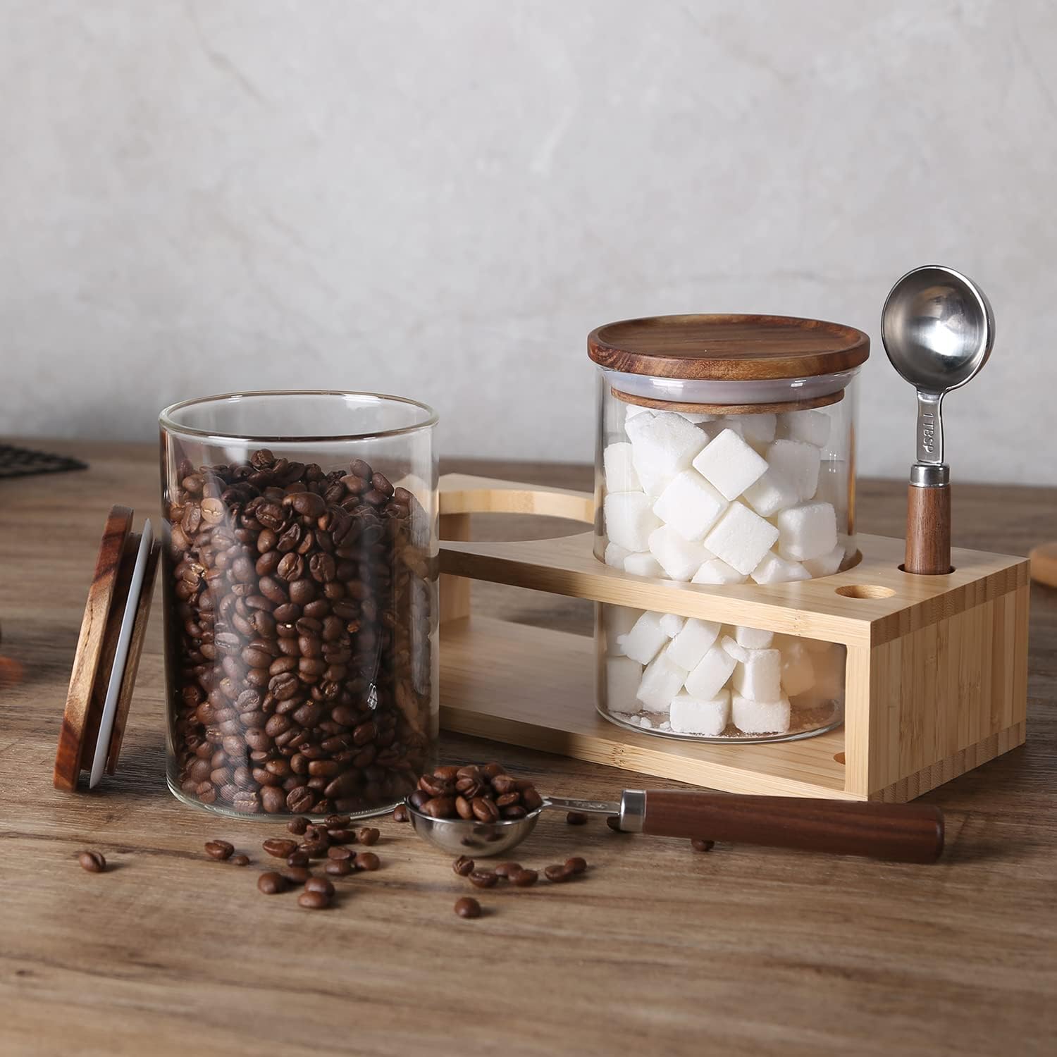 KKC HOME ACCENTS Vacuum Sealed Sugar Coffee Container set with Spoon for Countertop,Glass Sealed Jar Canisters with Wood Lids for Loose Leaf Tea,Sugar,Salt,25 Fluid-oz