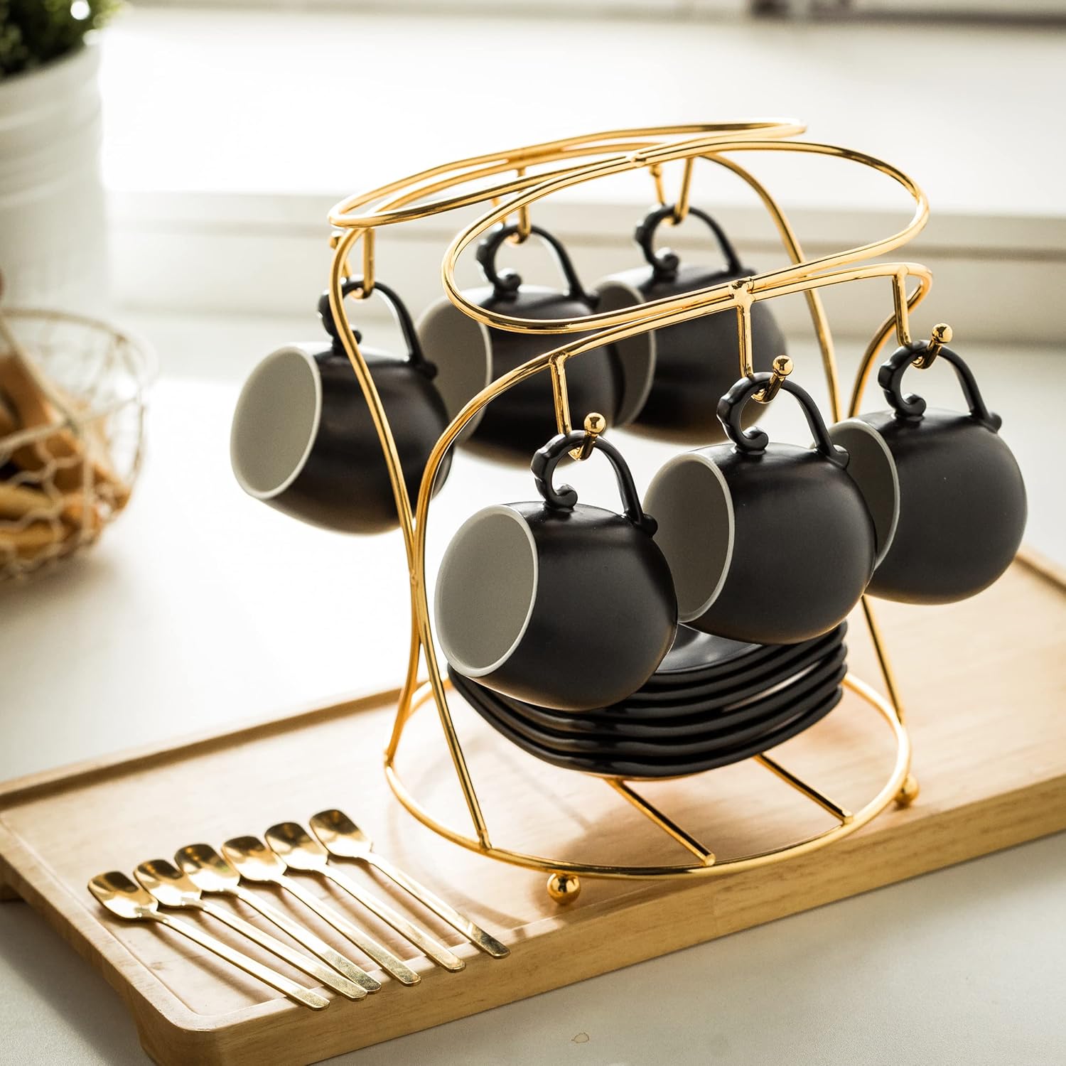 LYEOBOH Espresso Cups with Saucers Set, 3 Ounces Porcelain Coffee Cups with Metal Stand and Spoons, Cappuccino Cups Cute Demitasse Cups for Coffee Drinks, Latte, Tea Set of 6, Black
