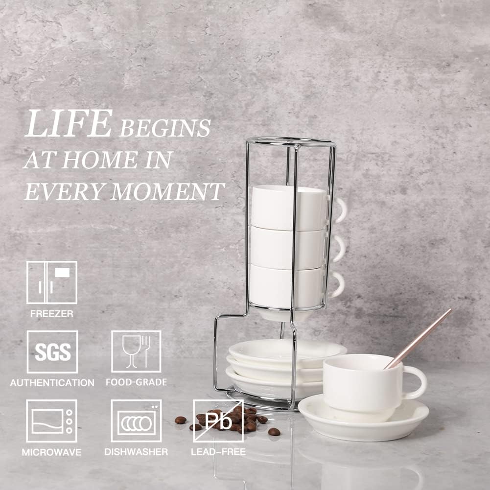 Sweejar Porcelain Espresso Cups with Saucers, 2.5 Ounce Stackable Cappuccino Cups with Metal Stand for Coffee Drinks, Latte, Tea - Set of 4 (White)