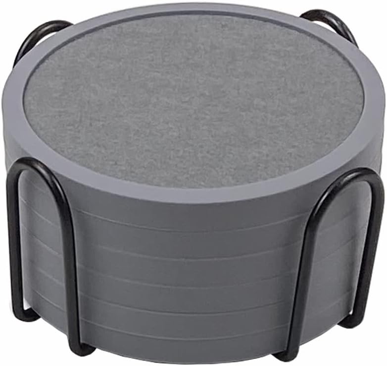 - What You Get: 6 non-slip silicone drink coasters(round, black, 4.3 inch), 6 absorbent felt inserts(round, grey) and a 4.5-inch metal holder(black). The silicone coasters can be used alone, or with the inserts.