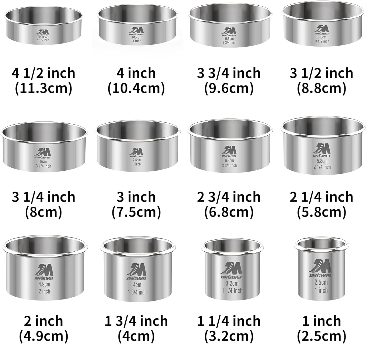 - ❀{12 pcs Round Cutter set }The large Cookie cutter set of 12 different sizes , Biscuit cutter set/round cake cutter sizes: Dia. 1inch(2.5cm), 1 1/4 inch(3.2cm), 1 3/4inch(4cm), 2inch(4.9cm), 2 1/4 inch(5.8cm), 2 3/4inch(6.8cm), 3inch(7.5cm), 3 1/8inch(8cm), 3 1/2inch(8.8cm), 3 3/4inch(9.6cm), 4inch(10.4cm), 4 1/2inch(11.3cm), Height: 1 1/4 inch (3 cm). Meet your different needs.