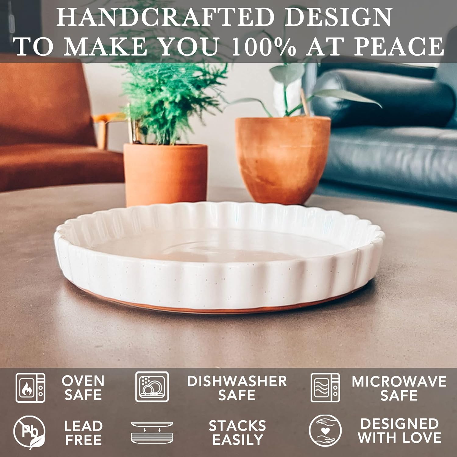 Mora Ceramic Tart Pan, 9.5 Inch Large Porcelain Baking Dish for Tarts, Quiche, Pie, Flan etc. Fluted Ruffled Edge, Oven, Microwave, Freezer, and Dishwasher safe - Great Gift For Bakers - Vanilla White