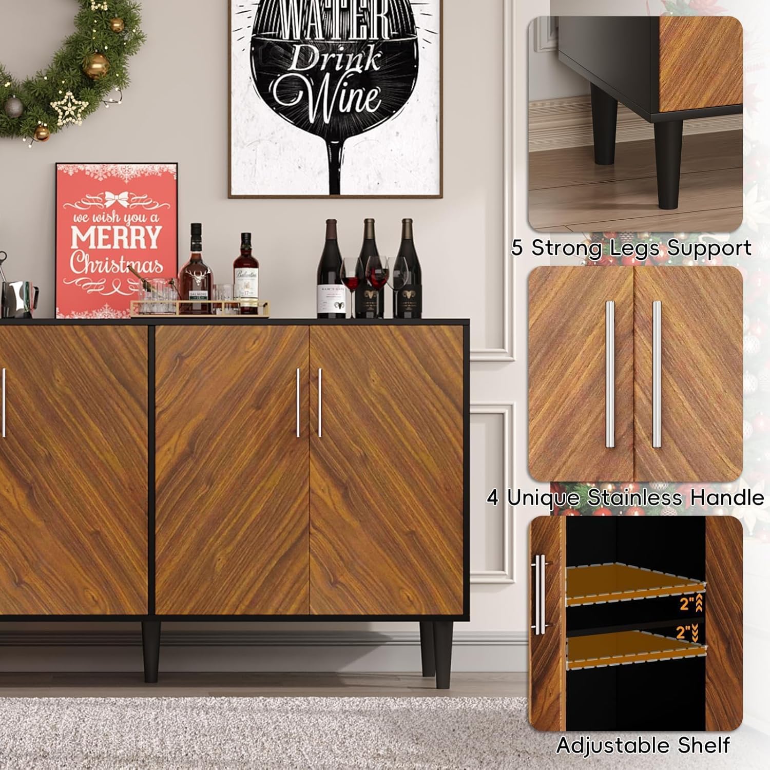 4 EVER WINNER Buffet Cabinet with Storage, 58" Sideboard Cabinet with Adjustable Shelves, Modern Coffee Bar with 4 Doors for Living Room Entryway, Walnut and Black