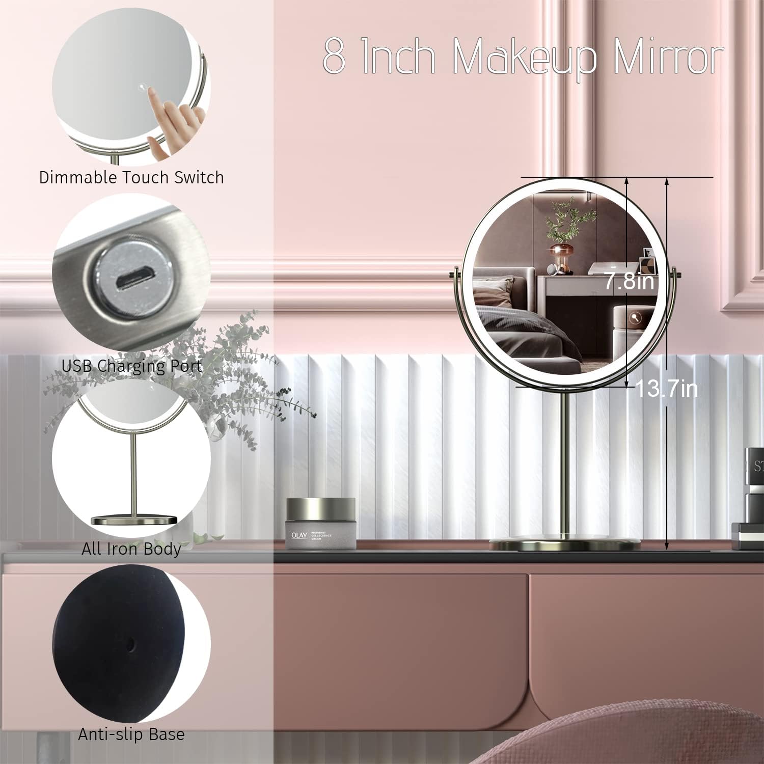 8" Lighted Vanity Mirror with Lights, 1X/10X Magnifying Makeup Mirror, Double Sided 360 Swivel USB Rechargeable, 3 Color Lights, Gifts for Women Mom Teen Girls