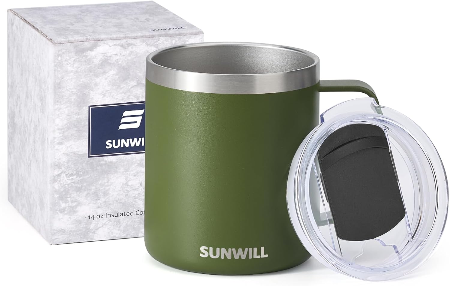 SUNWILL Travel Coffee Mug with Lid, Insulated Tumbler with Handle, 14 oz Stainless Steel Cup for Camping, Office, Home, Powder Coated Olive