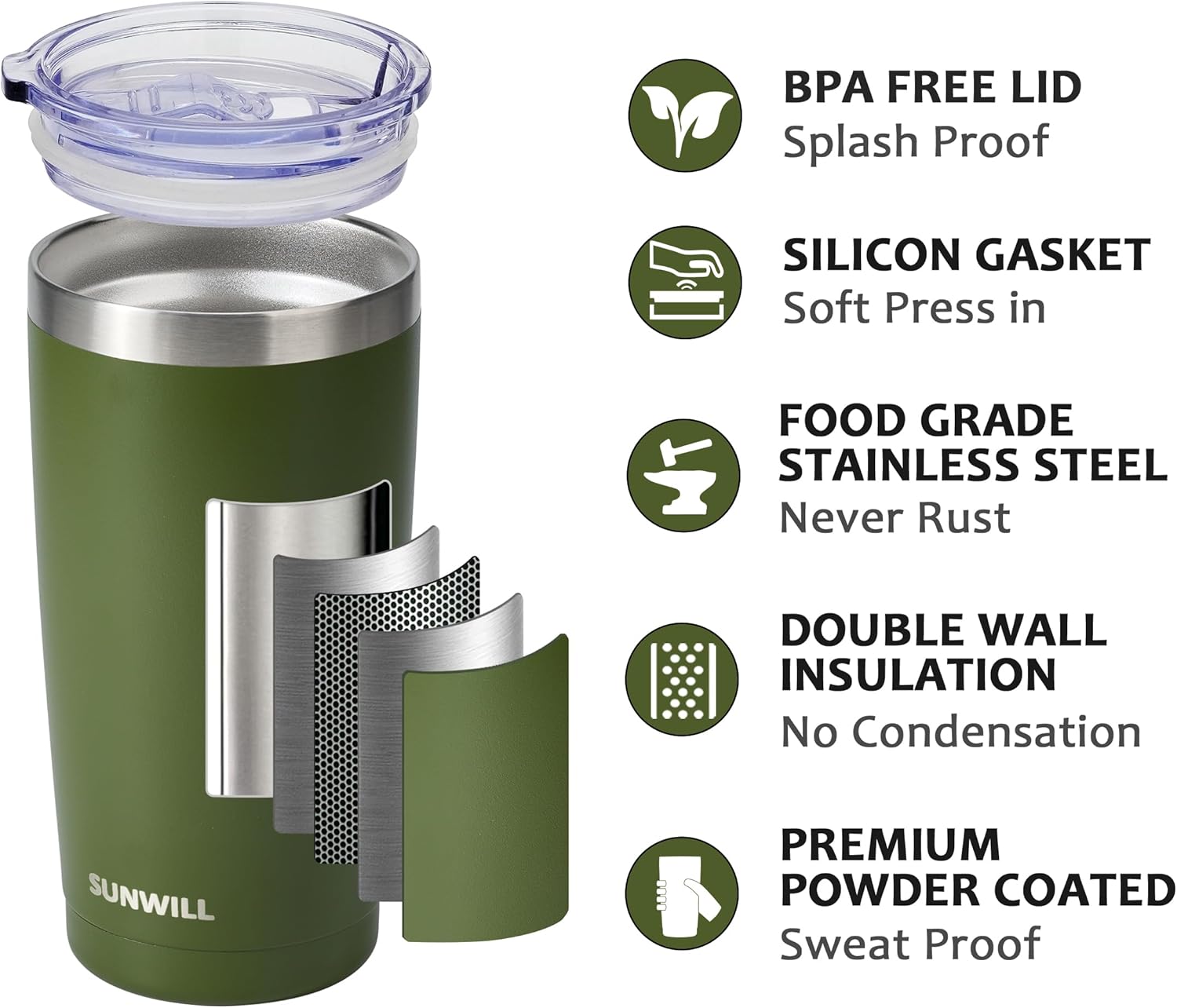 SUNWILL Travel Coffee Tumbler 20 oz, Insulated Mug with Lid, Stainless Steel Cup for Outdoor, Powder Coated Olive