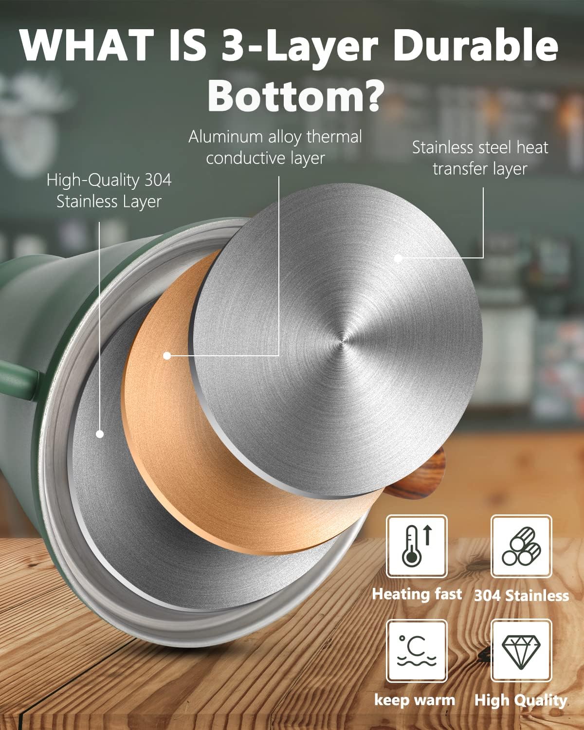 - Three layer base enhances heat retention and durability: Professional grade 18/8 stainless steel construction with triple layer base prevents rust and leaks; Uniform heat circulation ensures rapid boiling on gas, induction or electric stoves; Medium heat setting below 1400W recommended for induction compatibility