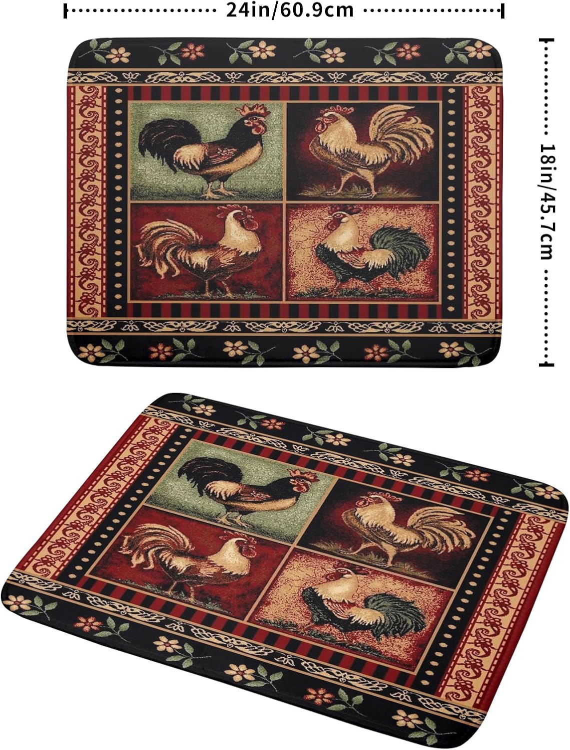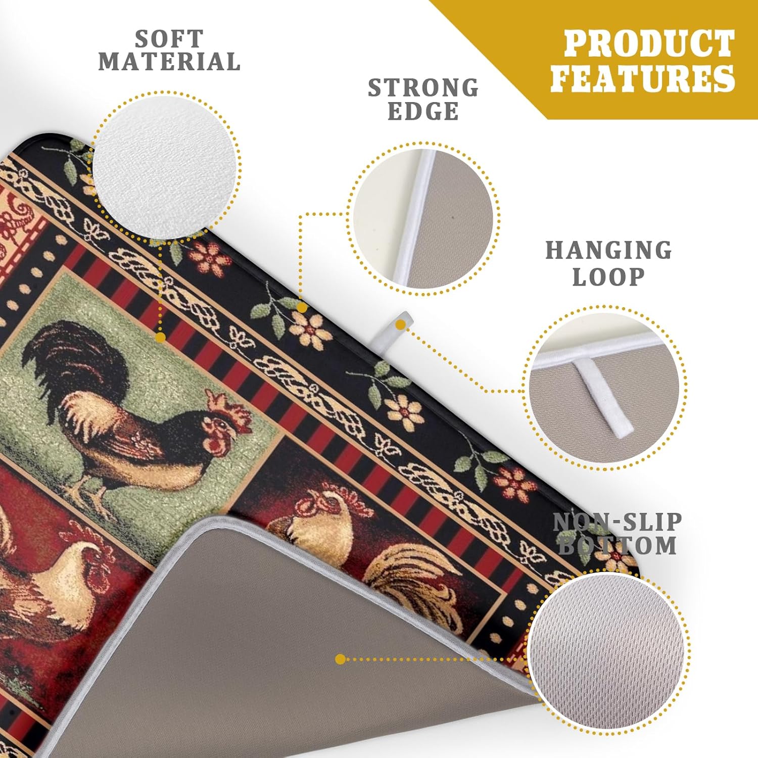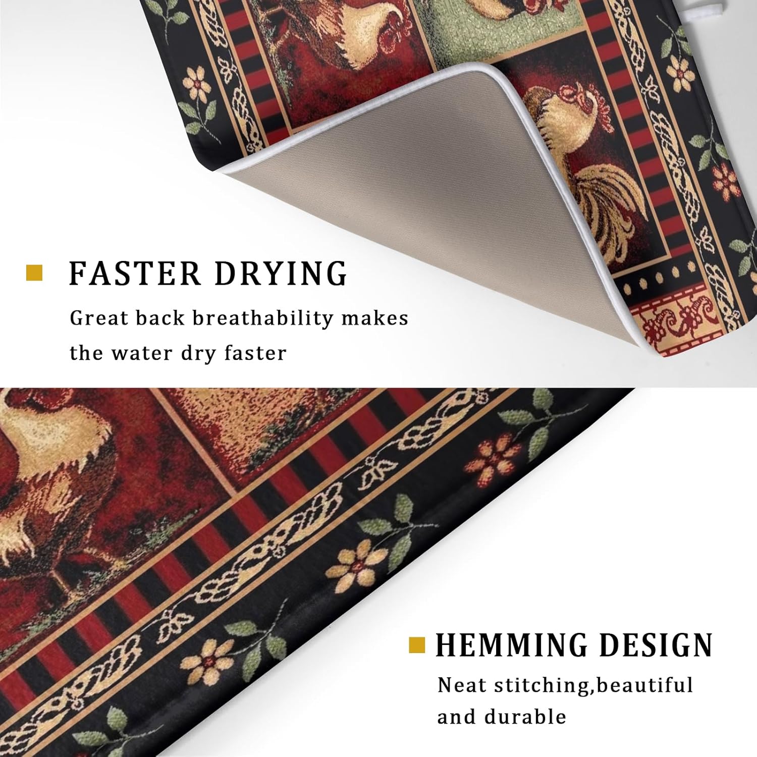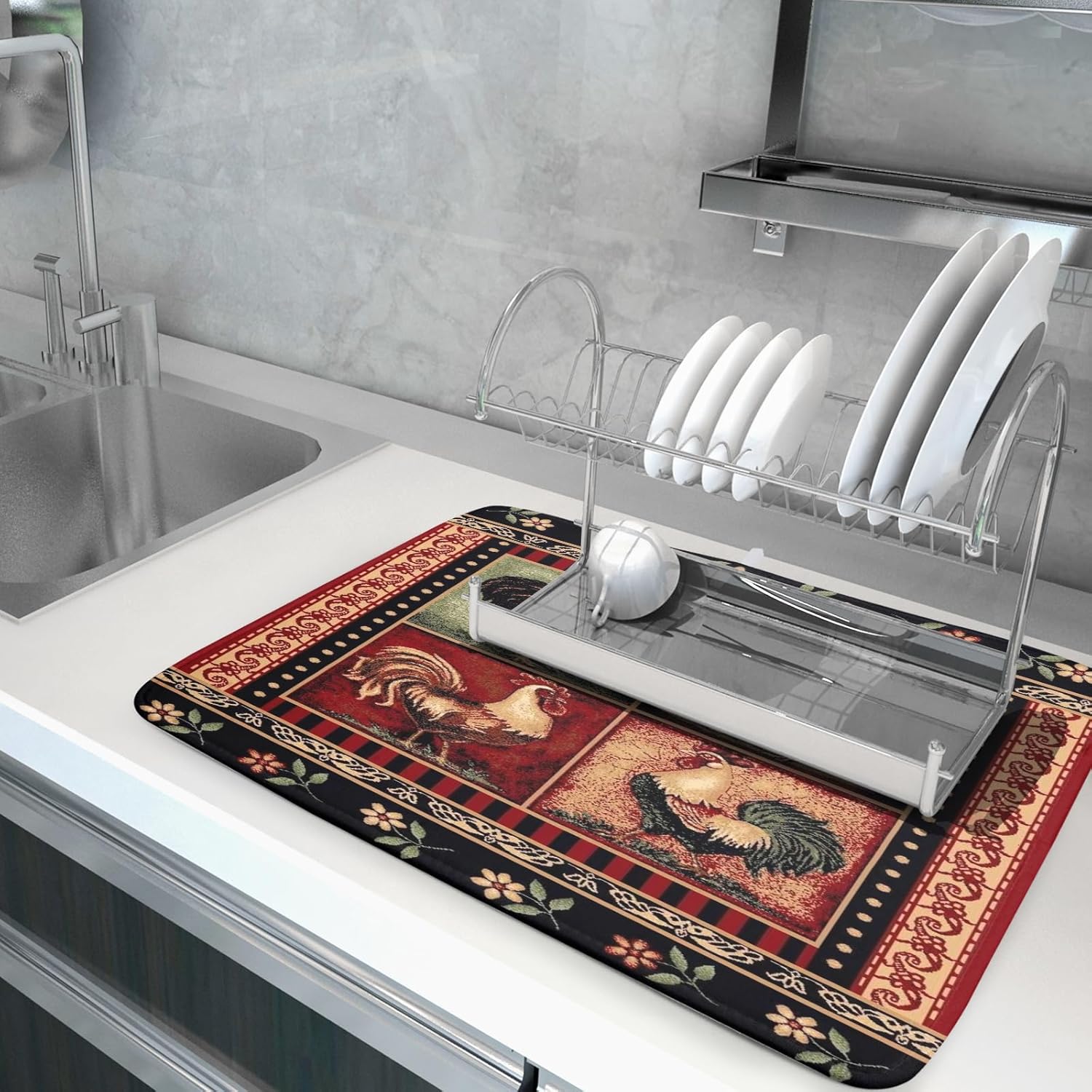 - ❀ 【SPECS & WATERPROOF BACKING】 The vintage rooster print dish drying mat is made of absorbent fabric, this 3-ply polyester provides a soft cushion. 24" X18", fitting most counters snugly while providing a smart and sharp look, a gorgeous decoration for kitchen. Moreover, the waterproof backing stops liquids from soaking through, damaging or staining the surface below and allows moisture to evaporate quickly at the same time.
