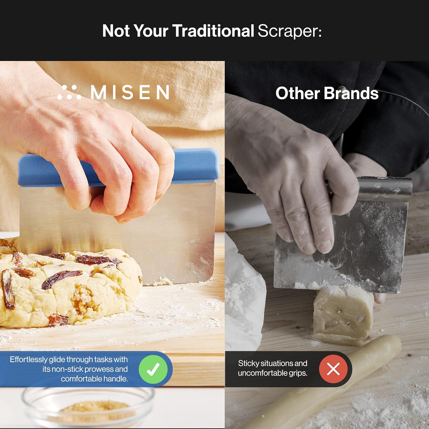- Ergonomic Handle for Unmatched Comfort and Control: Say goodbye to discomfort and hello to a comfortable grip. The Misen Bench Scraper features an ergonomically-designed handle securely fastened with rivets, ensuring it won't come loose.