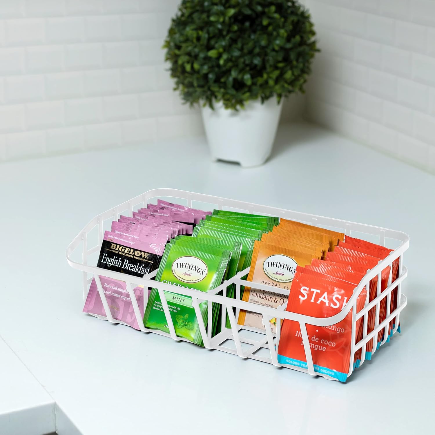 Tea Bag Organizer Caddy - Metal Tea Box Storage Holder for Cups, Pods, Packets, Condiment Accessories - White
