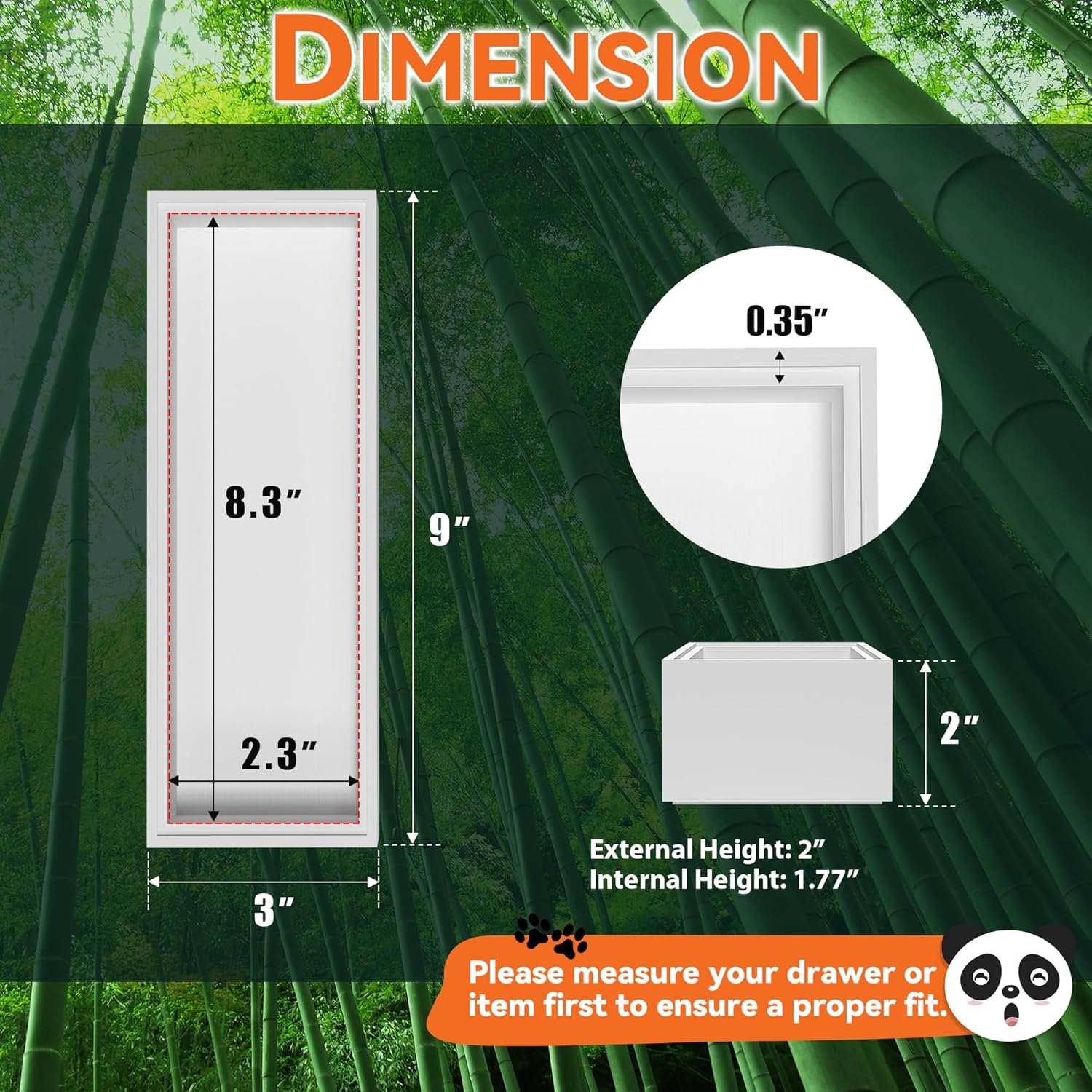 - Each bamboo drawer organizer measures: external size: 9" L x 3" W x 2" H; internal size: 8.3" L x 2.3" W x 1.77" H. Please check the size before purchasing
