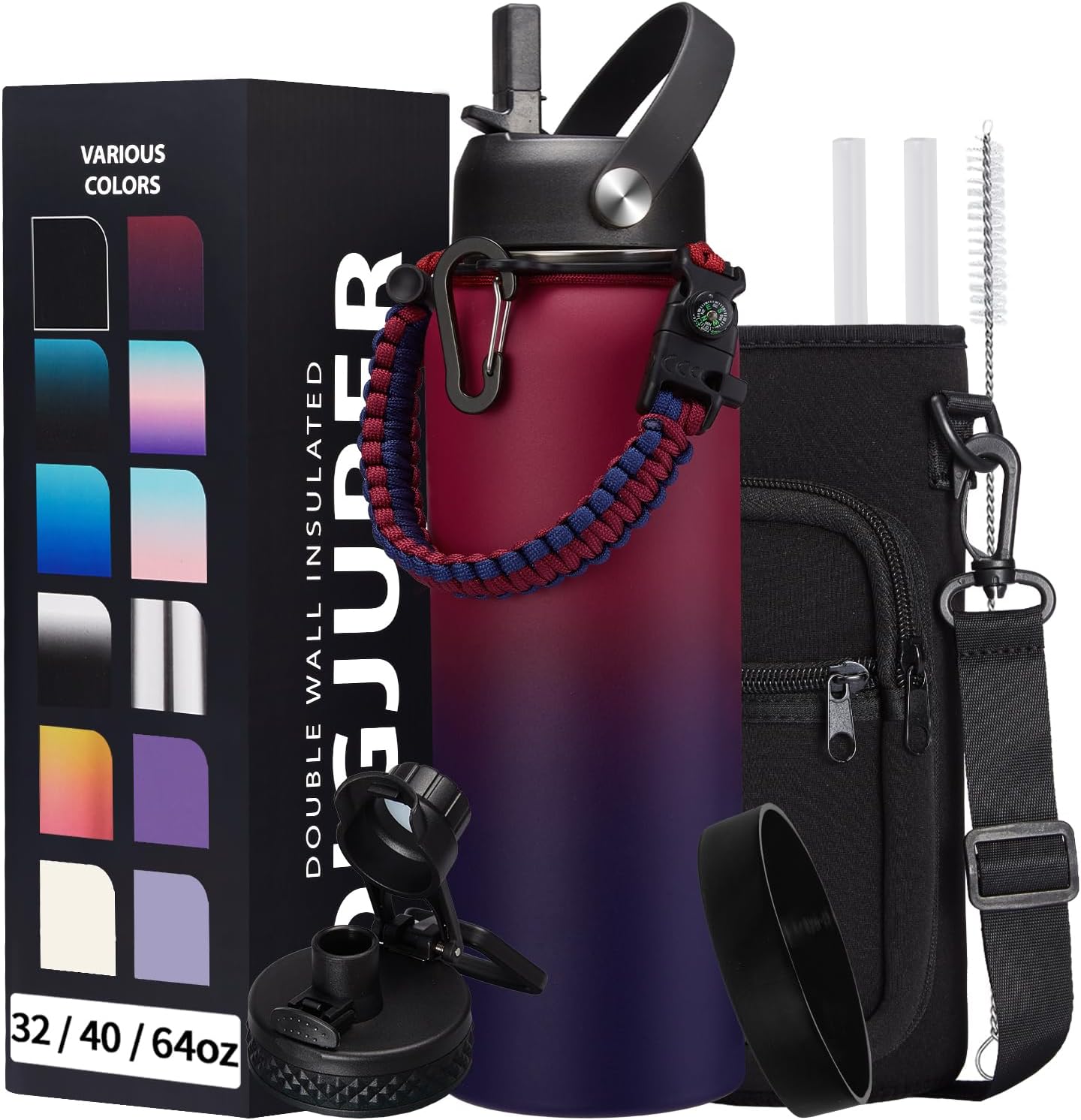 - COMBO—Super Deal: Buy 40oz stainless steel water bottles and get 9 accessories (2 x lids, 1 x survival paracord, 1 x carrying pouch, 1 x shoulder strap, 1 x protective cup mat, 2 x straws, 1 x straw brush). WITH A LIFETIME GUARANTEE, these thermal water bottles are the perfect gift for use at home, work, school, road trips, hiking, sporting events, or just hanging out