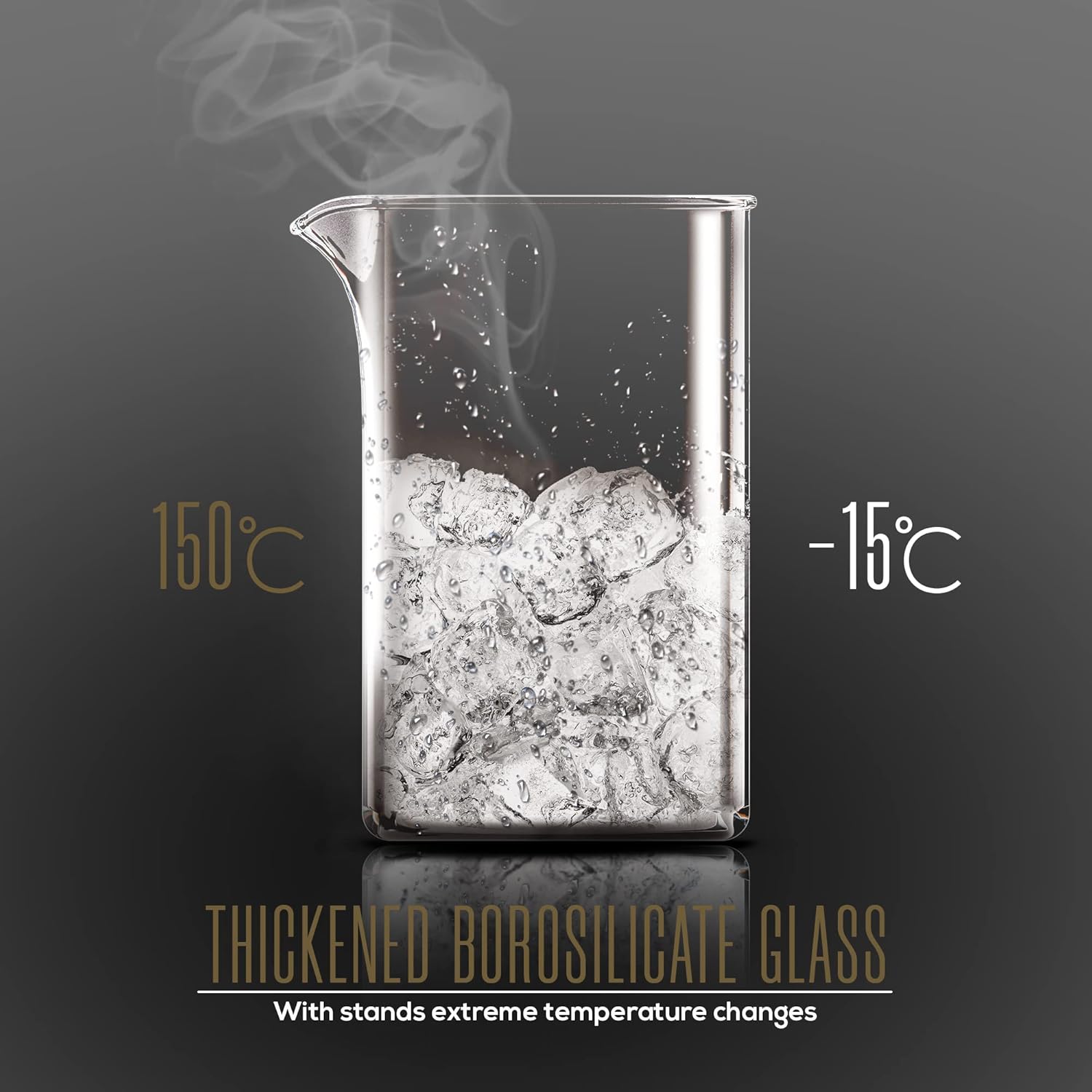 - Durable heat resistant borosilicate glass carafe beaker sits in stylish insulated plastic frame which makes pouring coffee easier and prevent wobbling