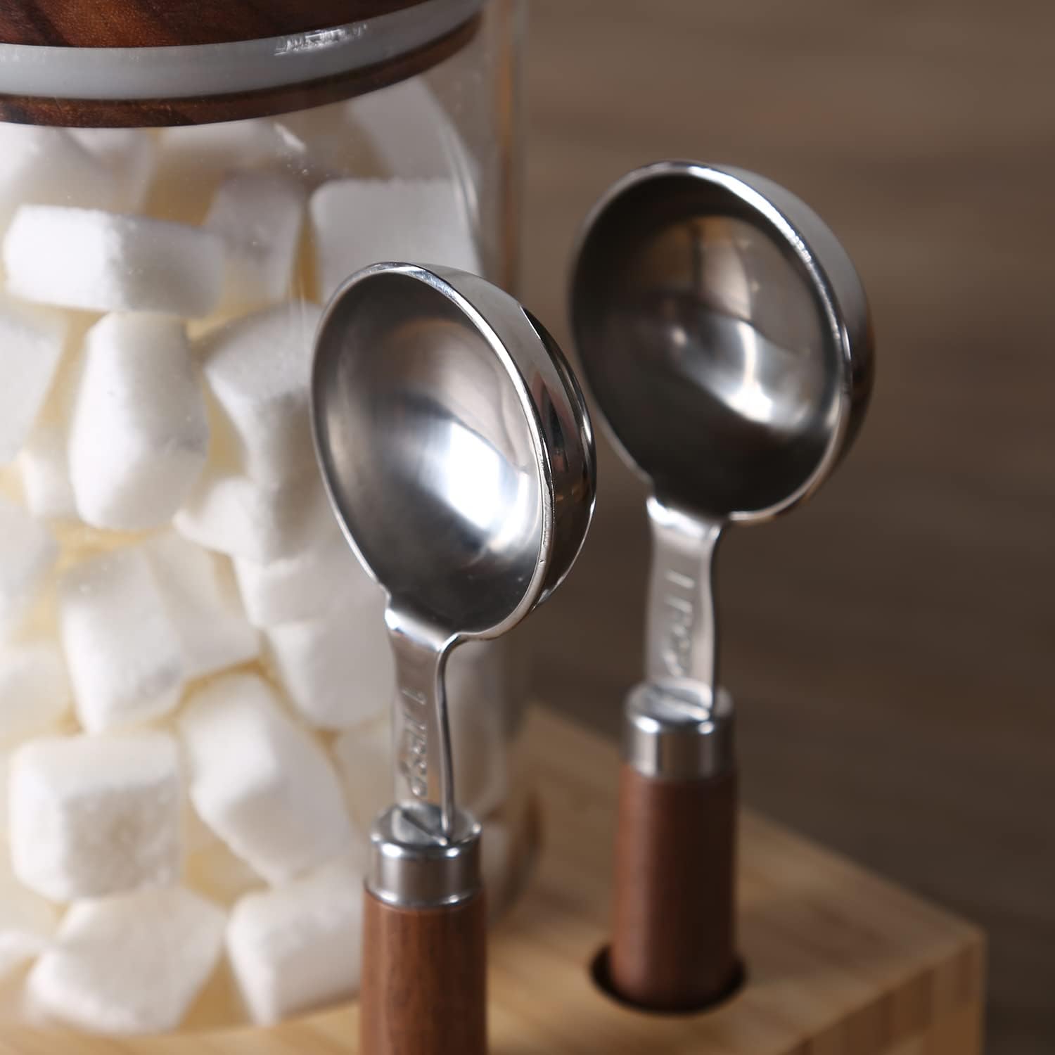 - Complete Set Includes:2 sealed glass jars(height 7.44" x diameter 3.74",capacity:39 floz/1150ml),2 wooden handle scoops(1 TBSP) and 1 bamboo rack(10.24" x 4.5" x 2.76",L x W x H),label stickers.