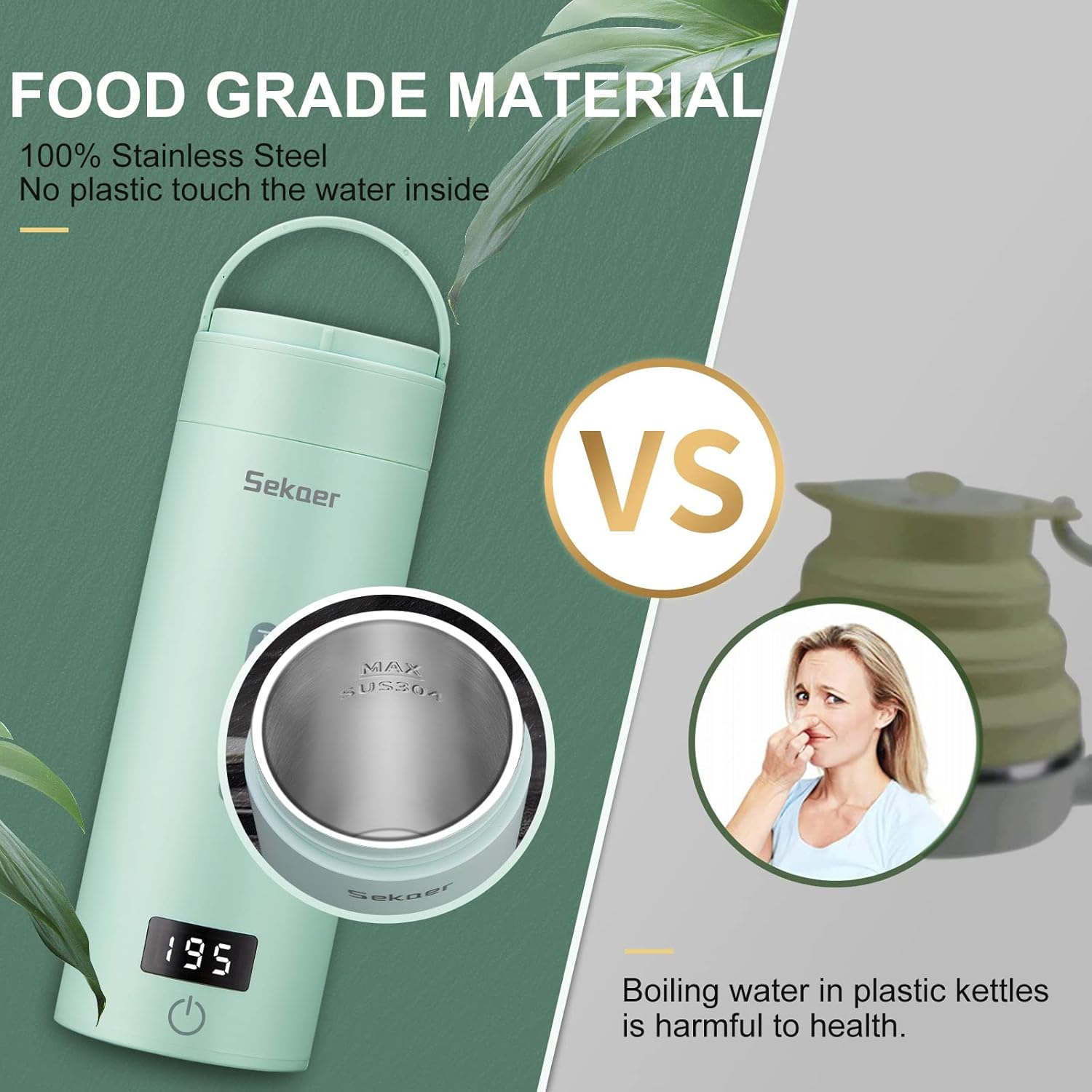 Sekaer Travel Electric Tea Kettle Portable Small Mini Coffee Kettle, with 4 Variable Presets, Personal Hot Water Boiler 304 Stainless Steel with Auto Shut-Off & Boil Dry Protection, SY-618G