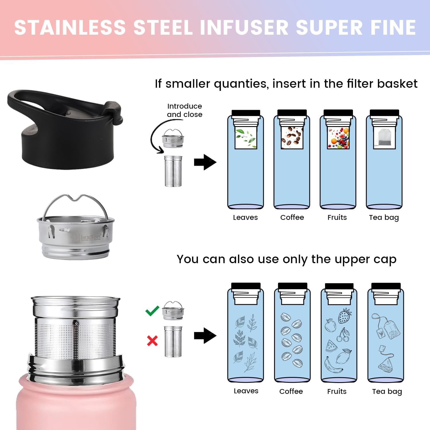 - ✅ LIDS & INFUSER/STRAINER- Lexlion water bottle 22 oz comes W/3 LIDS! a spout lid, a flip lid & and a third lid which is stainless steel lid, 100% leak-proof & dishwasher safe. It includes a newly designed 2-piece strainer stainless steel, a very convenient filter to make loose tea leaves, cold coffee brews, herbs, or fruit-infused water. Add them to the filter basket, close it & clip in the tea water bottle infuser with water. If an infuser is not needed, just remove it.